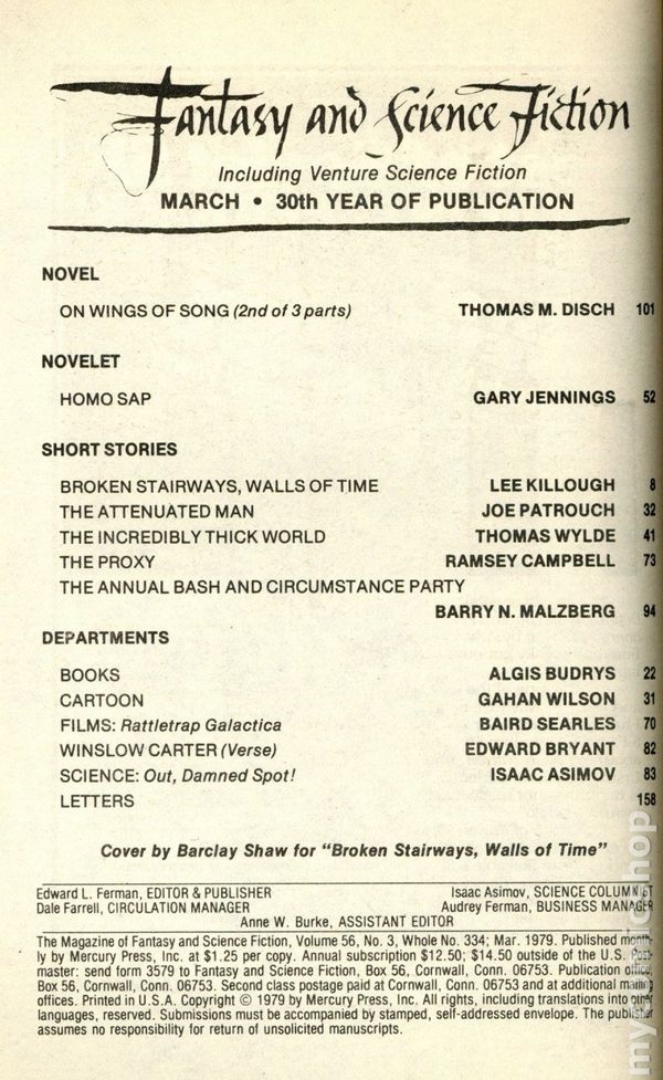 Volume 56, Issue 3 - March 1979. Cover by Barclay Shaw. Fantasy and science fiction stories by Thomas M. Disch, Gary Jennings, Lee Killough, Joe Patrouch, Thomas Wylde, Ramsey Campbell and Barry N. Malzberg. 5 1/2-in. x 7 1/2-in., 162 pages, B&W Cover price $1.25.