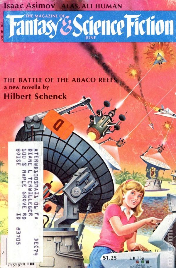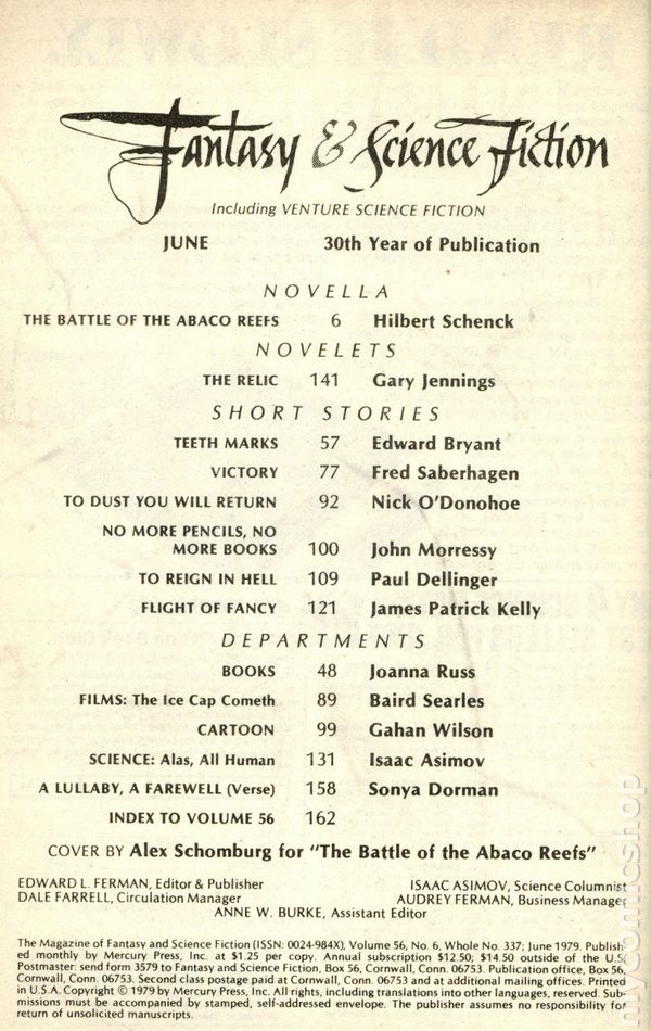 Volume 56, Issue 6 - June 1979. Cover by Alex Schomburg. Fantasy and science fiction stories by Hilbert Schenck, Gary Jennings, Edward Bryant, Fred Saberhagen, Nick O'Donohoe, John Morressy, Paul Dellinger and James Patrick Kelly. Science article by Isaac Asimov. 5-in. x 7-in., 162 pages, Text (with B&W illustrations). Cover price $1.25.
