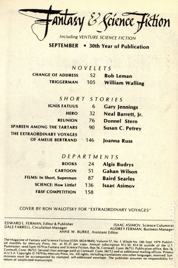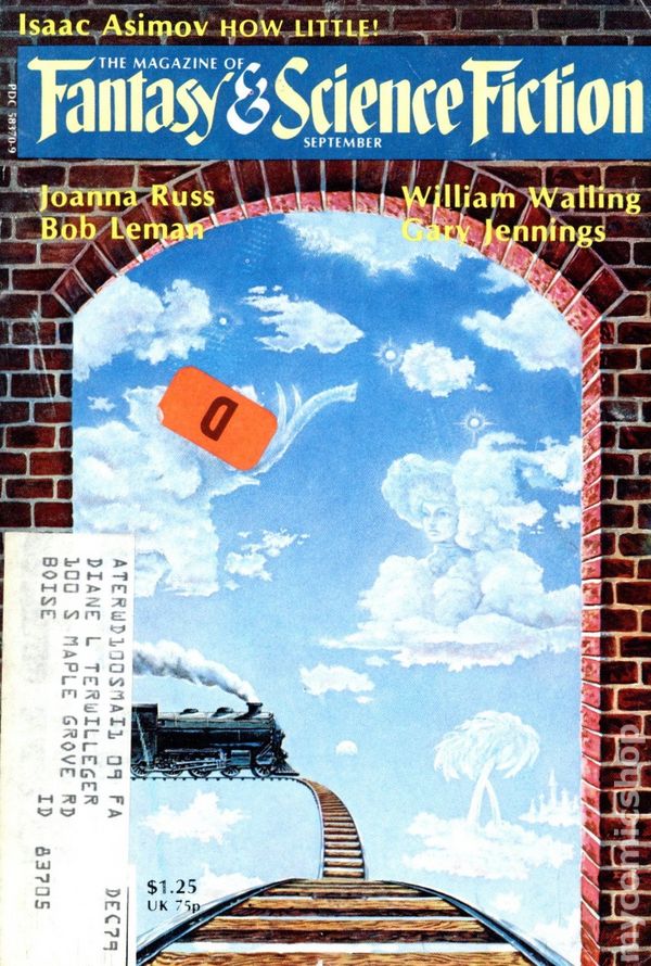 Volume 57, Issue 3 - September 1979. Cover by Ron Walotsky. Fantasy and science fiction stories by Bob Leman, William Walling, Gary Jennings, Neal Barrett, Jr., Donnel Stern, Susan C Petrey, Joanna Russ. 5 1/2-in. x 7 1/2-in., 162 pages, B&W Cover price $1.25.