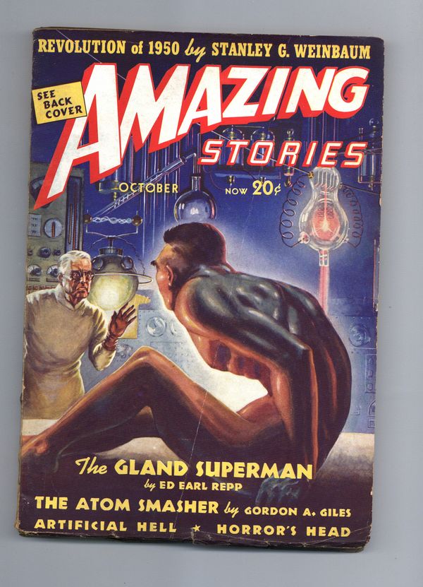 October, 1938. Cover by Robert Fuqua. Stories by Ed Earl Repp ("The Gland Superman"), Gordon A. Giles ("The Atom Smasher"), Lt. John Pease, Thornton Ayre, Frederic Arnold Kummer Jr., Harvey Emerson, and Stanley G. Weinbaum ("Revolution of 1950" part 1 of 2). Illustrations by Jay Jackson, Julian S. Krupa, and Robert Fuqua. 7" x 10"; black and white with color cover; 148 newsprint pages. Cover price $0.20.
