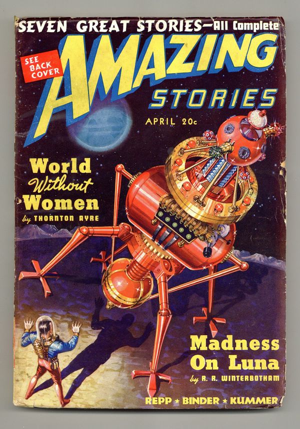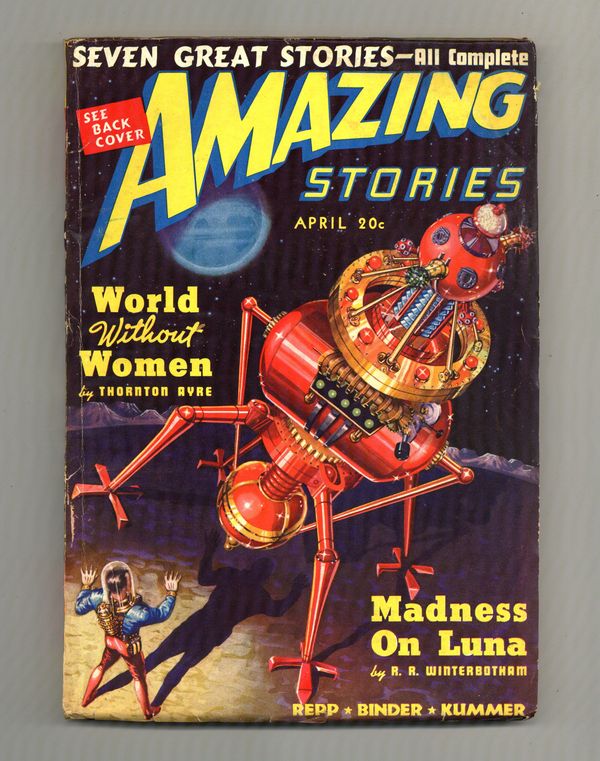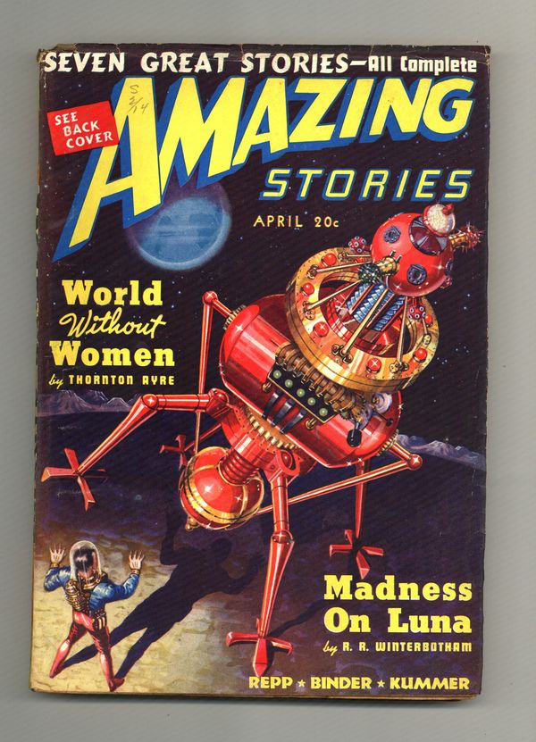 Volume 13, Issue 4 - April, 1939. Cover by Robert Fuqua. Stories by Thornton Ayre, R.R. Winterbotham, Polton Cross, Bradner Buckner, Ed Earl Repp, Eando Binder, and Frederic Arnold Kummer Jr.. Illustrations by Julian S. Krupa. 7" x 10"; black and white with color cover; 144 newsprint pages. Cover price $0.20.