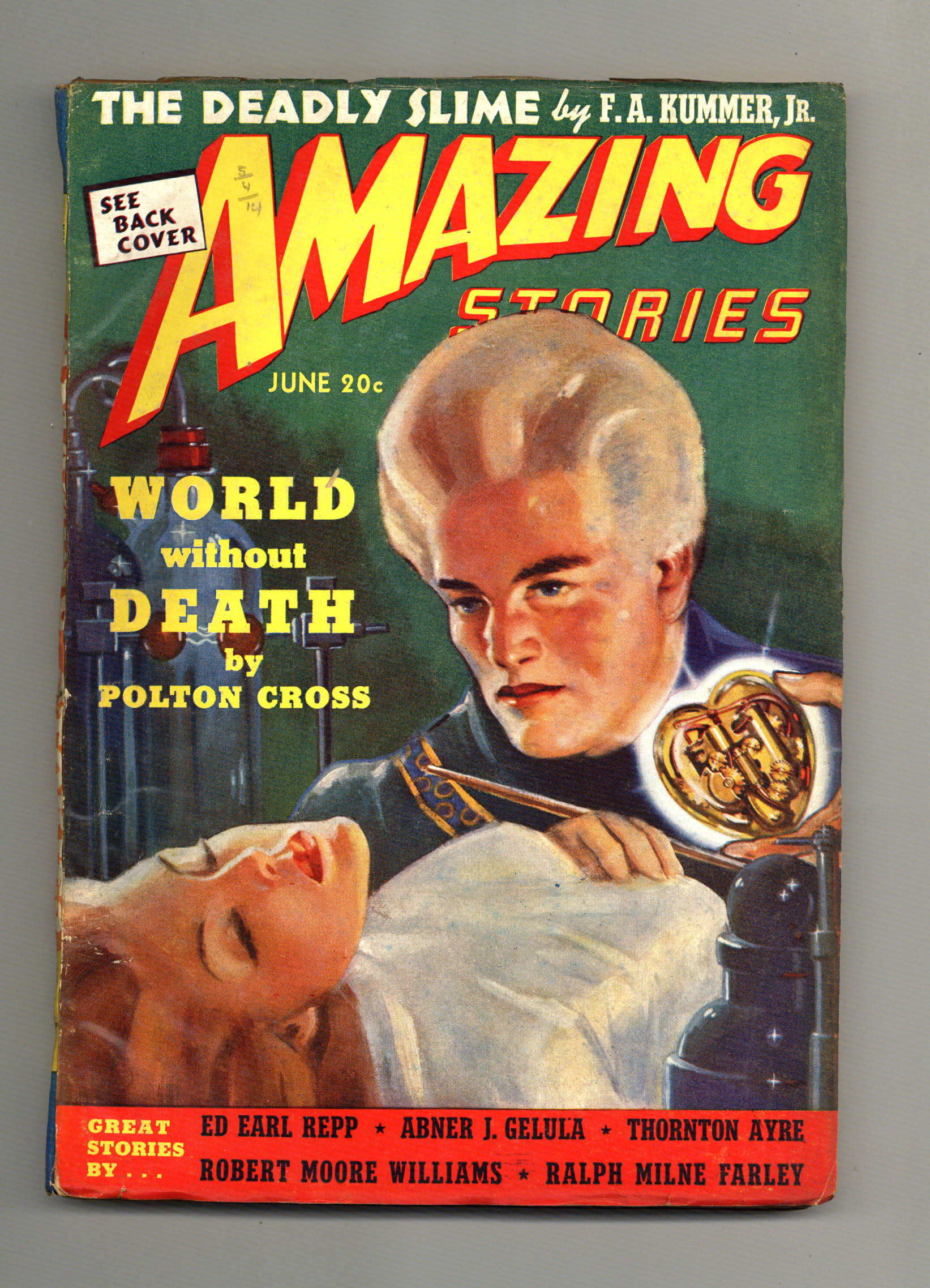 Volume 13, Issue 6 - June, 1939. Cover by William Juhre. Stories by F.A. Krummer Jr., Polton Cross, Ed Earl Repp, Abner J. Gelula, Thornton Ayre, Robert Moore Williams, and Ralph Milne Farley. 7" x 10"; black and white with color cover; 146 newsprint pages. Cover price $0.20.