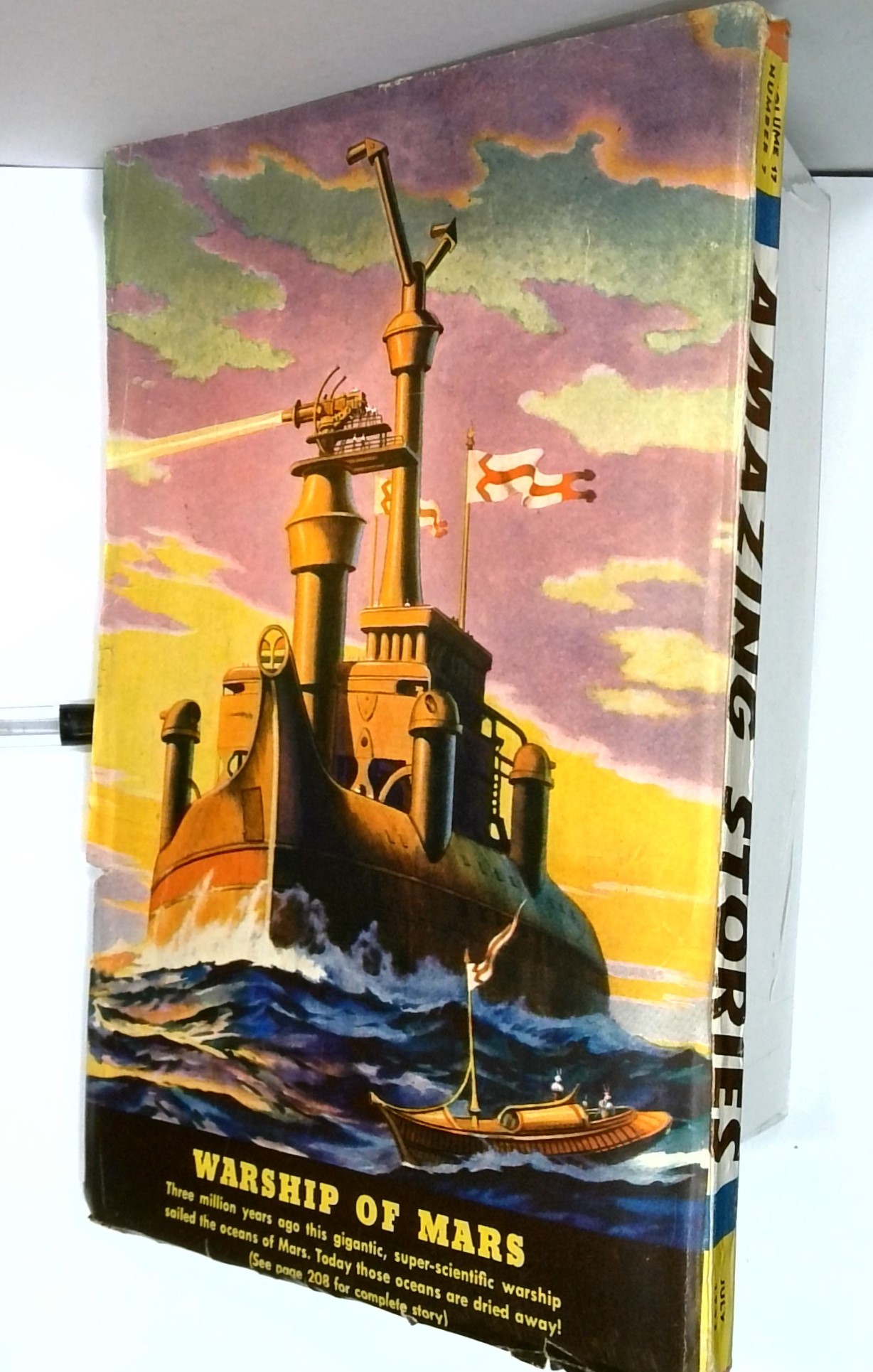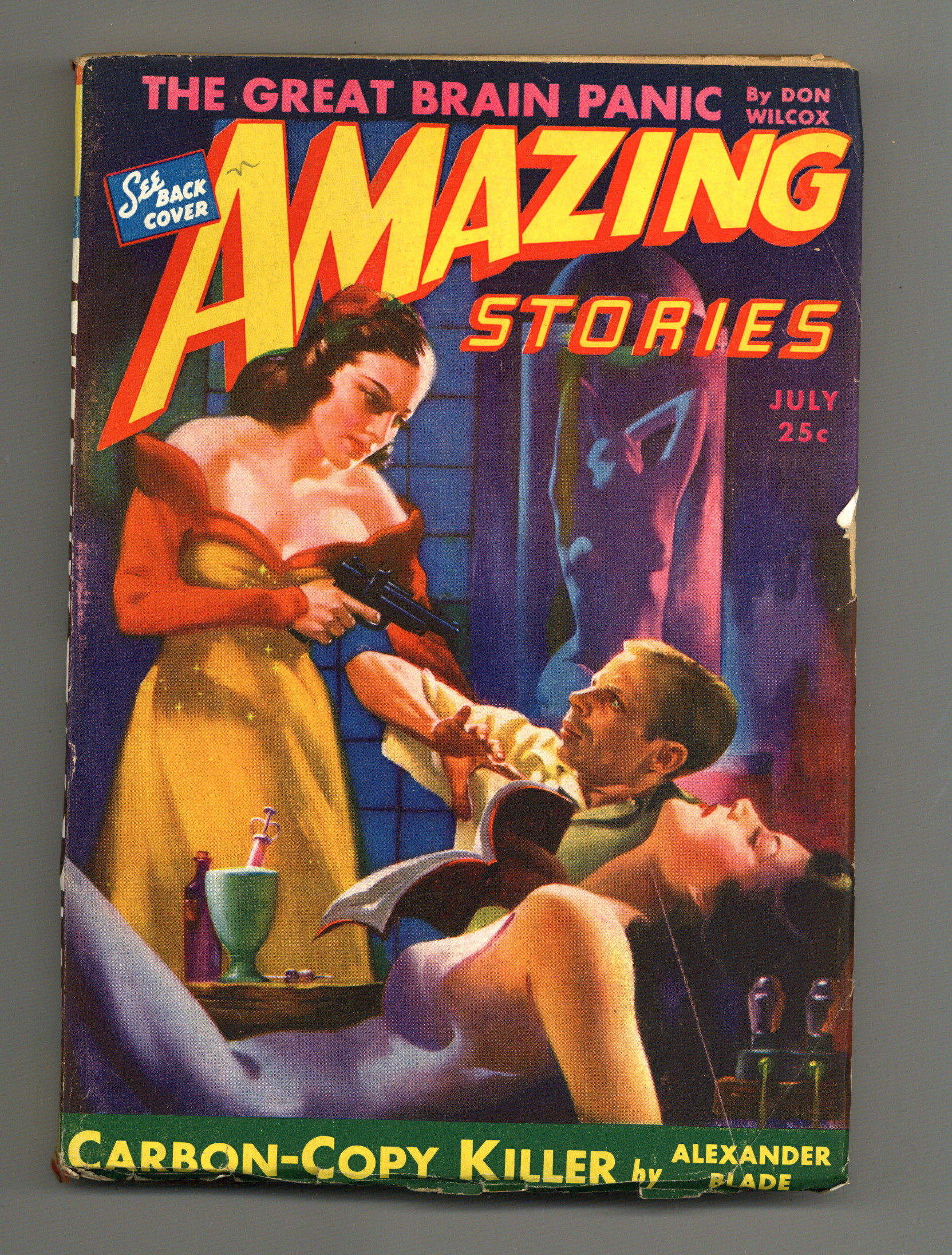 July 1943. Cover by H.W. McCauley. Stories by Robert Moore Williams, Festus Pragnell, P.F. Costello, Don Wilcox, Helmar Lewis, A.R. McKenzie, and Frank Patton. Illustrations by Virgil Finlay, Julian, Malcolm Schmidt, Magarian, Ronald Clyne, Robert Fuqua, and Joe Sewell. 7" x 10"; black and white with color cover; 210 newsprint pages. Cover price $0.25.