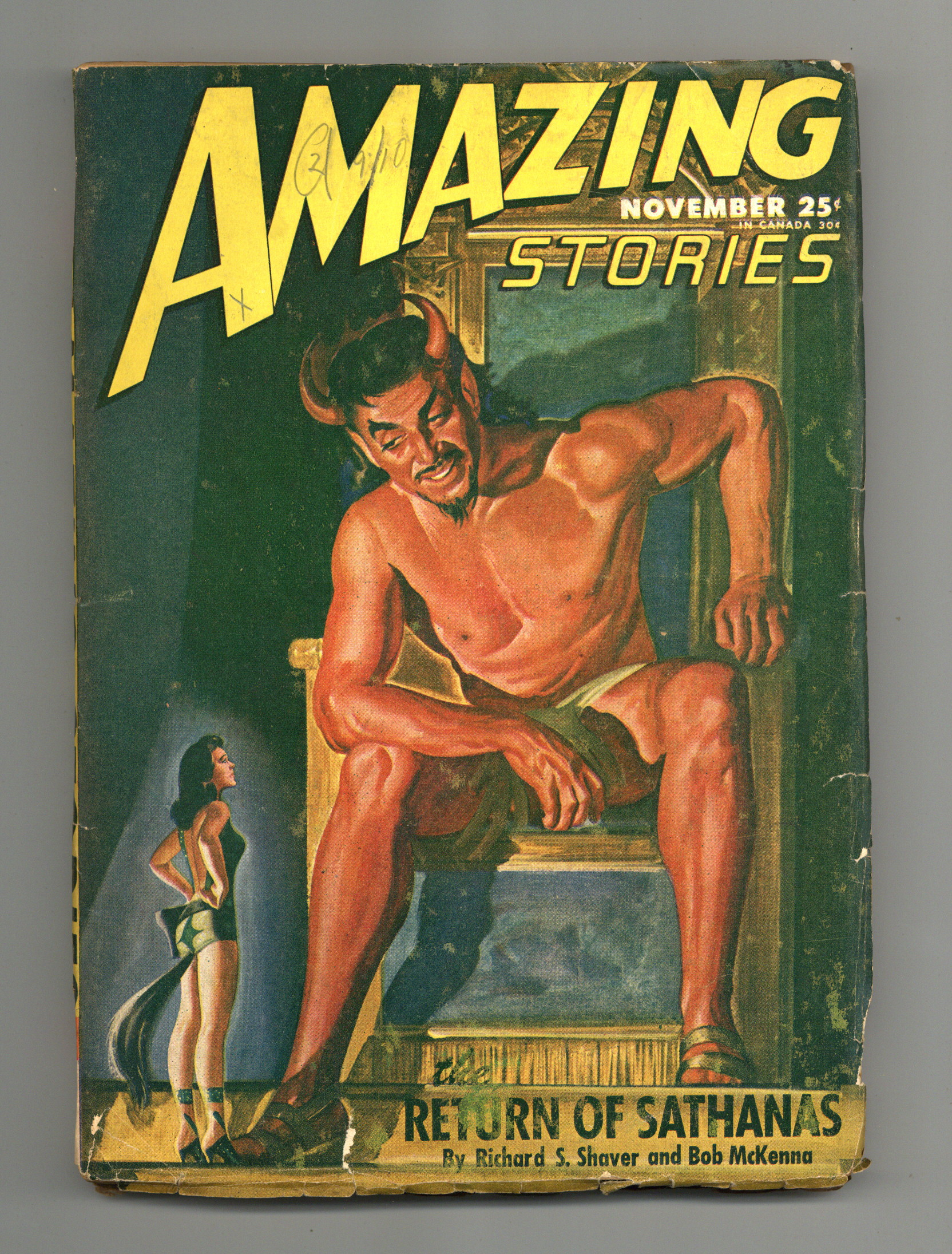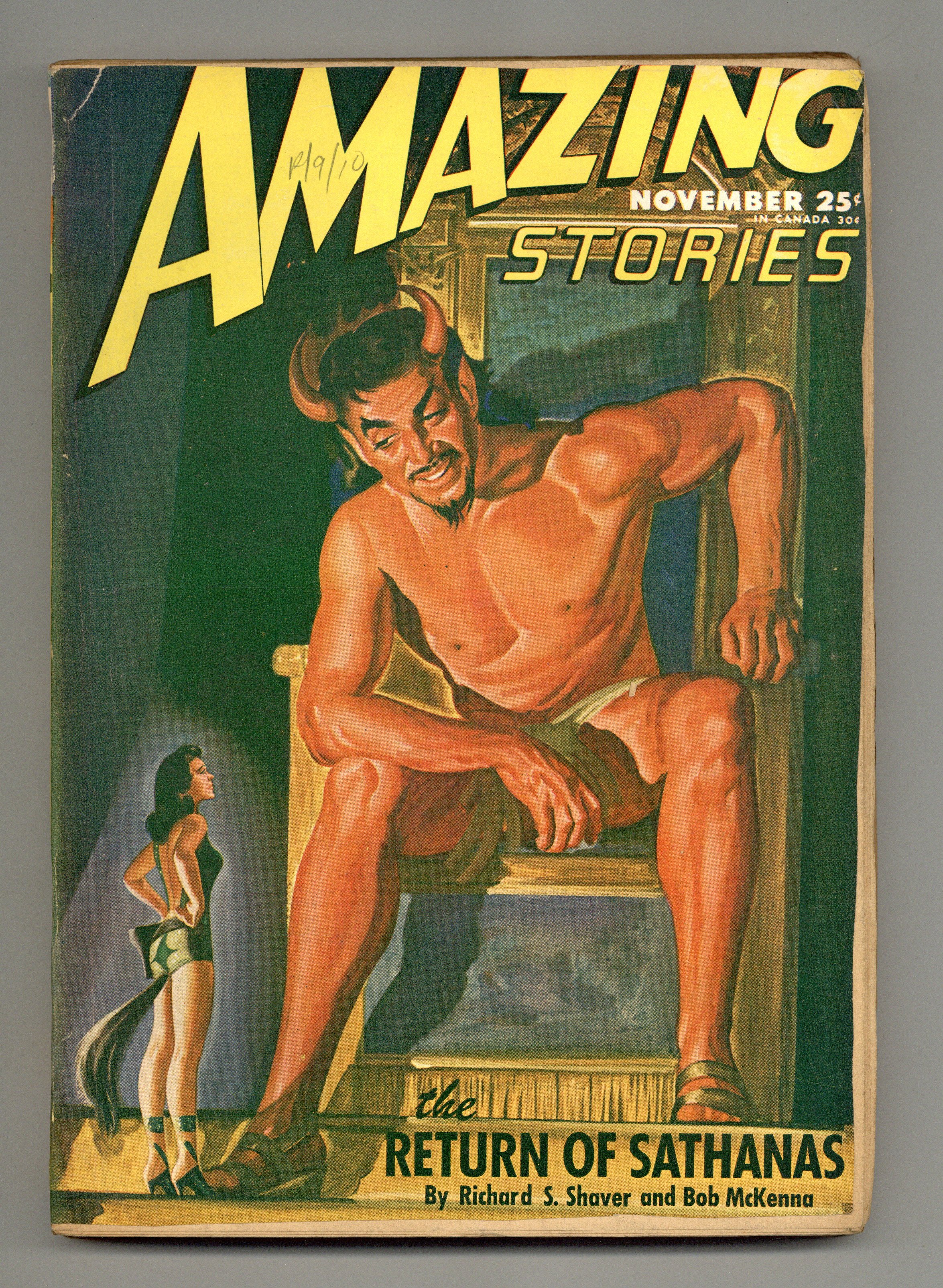 Volume 20, Issue 8 - November, 1946. Science fiction stories by Richard S. Shaver and Bob McKenna (a Lemuria story), Chester S. Geier, Frank G. Neiner, John and Dorothy de Courcy, Leroy Yerxa, J.S. Harrison, and Berkeley Livingston. Illustrations by Robert Fuqua, William A. Gray, Enoch Sharp, William Marsh, Rod Ruth, and Malcolm Smith. Cover by Arnold Kohn. 7-in. x 10-in.; black and white; 182 newsprint pages. Cover price $0.25.