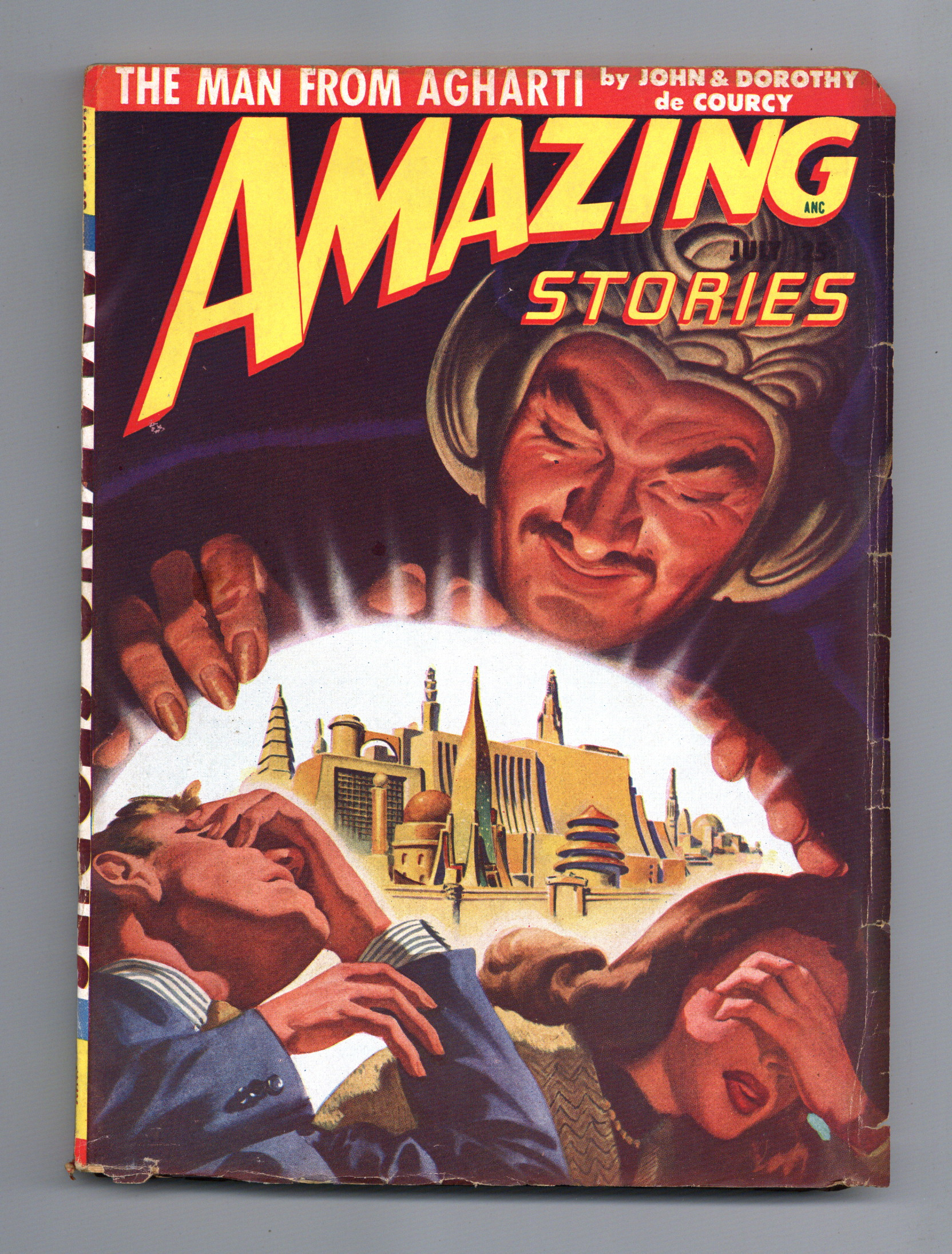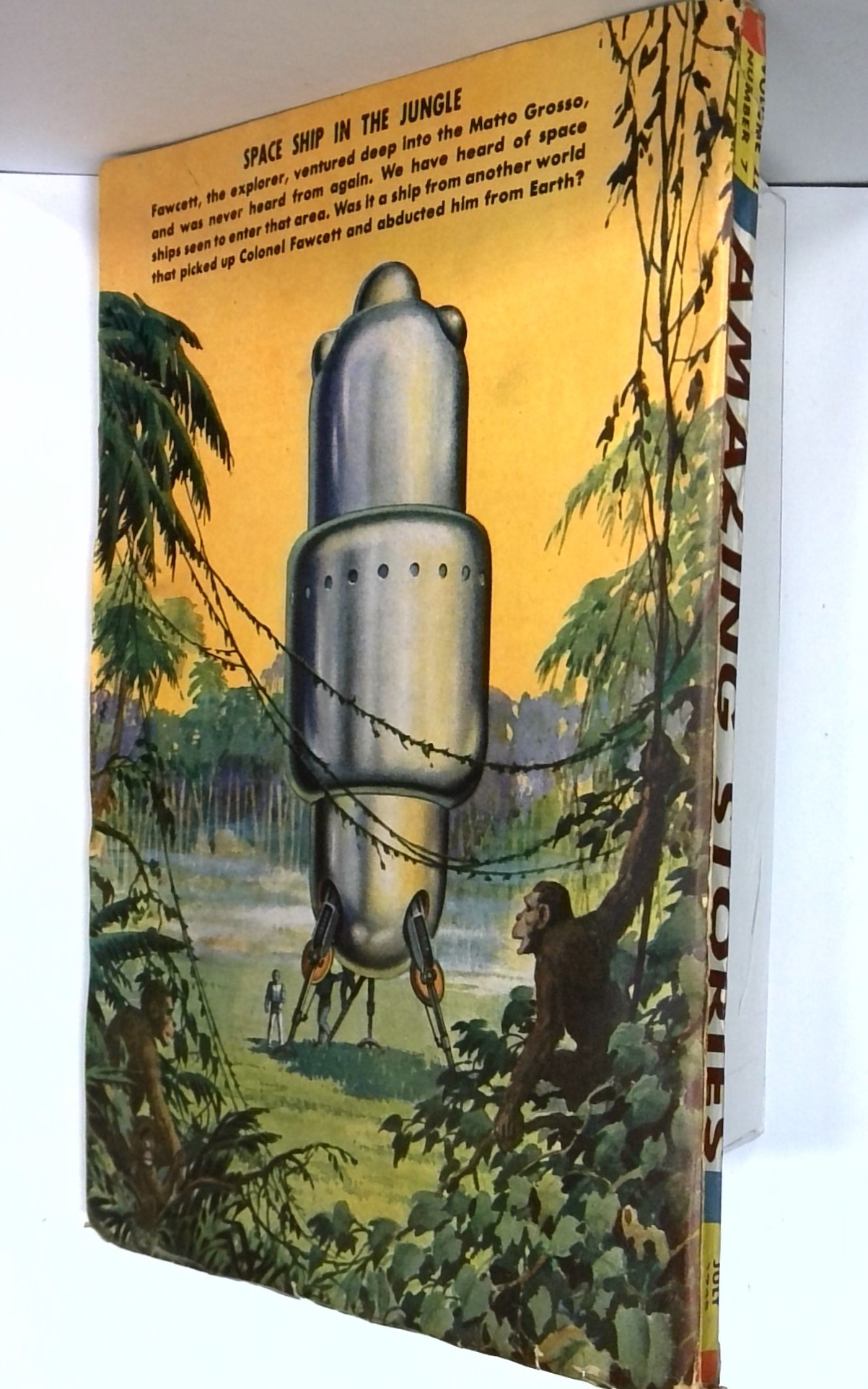 Ziff-Davis, NY, 1948. Vol. 22, No. 7. Pulp magazine. Edited by Raymond A. Palmer. Cover art by Arnold Kohn for "The Man from Agharti" (short novel) by John & Dorothy de Courcy; rear cover illustration by James B. Settles showing "Space Ship in the Jungle." Includes "Mystery of the Midgets" (novelette) by A. K. Jarvis; "The Death of Asteroid 13" (novelette) by William P. McGivern; "That We May Rise Again" by Charles Recour; "In All Probability" by Irving Gerson; "The Triumph of the Pig" by Berkeley Livingston; "The Supernal Note" by Rog Phillips; "Amoeba 'Roid" by Charles Recour. Features: "The Observatory"; "The New Telescope" by Frances Yerxa; "Rotary Robot" by A. Morris; "Blast Furnace Booster" by Anthony B. Ott; "Vignettes of Famous Scientists" by Alexander Blade; "Go Away, Gravity" by Pete Bogg; "Cold Above the Earth" by R. Dee; "The Club House" by Rog Phillips; "Scientific Mysteries; The Mysterious Easterners" by L. Taylor Hansen; "Trick with Torque" by George Wells; "Mayan Mathematics" by Carter T. Wainwright; 'If We Get a Chance" by Richard S. Shaver; "Emptiness" by Robert Newton; "What Is Mathematics?" by M. Casey. Illustrated by Julian S. Krupa, Rod Ruth, William A. Gray, Raymond Naylor, and Malcolm Smith. 7" x 10"; black and white; 162 newsprint pages. Cover price $0.25.