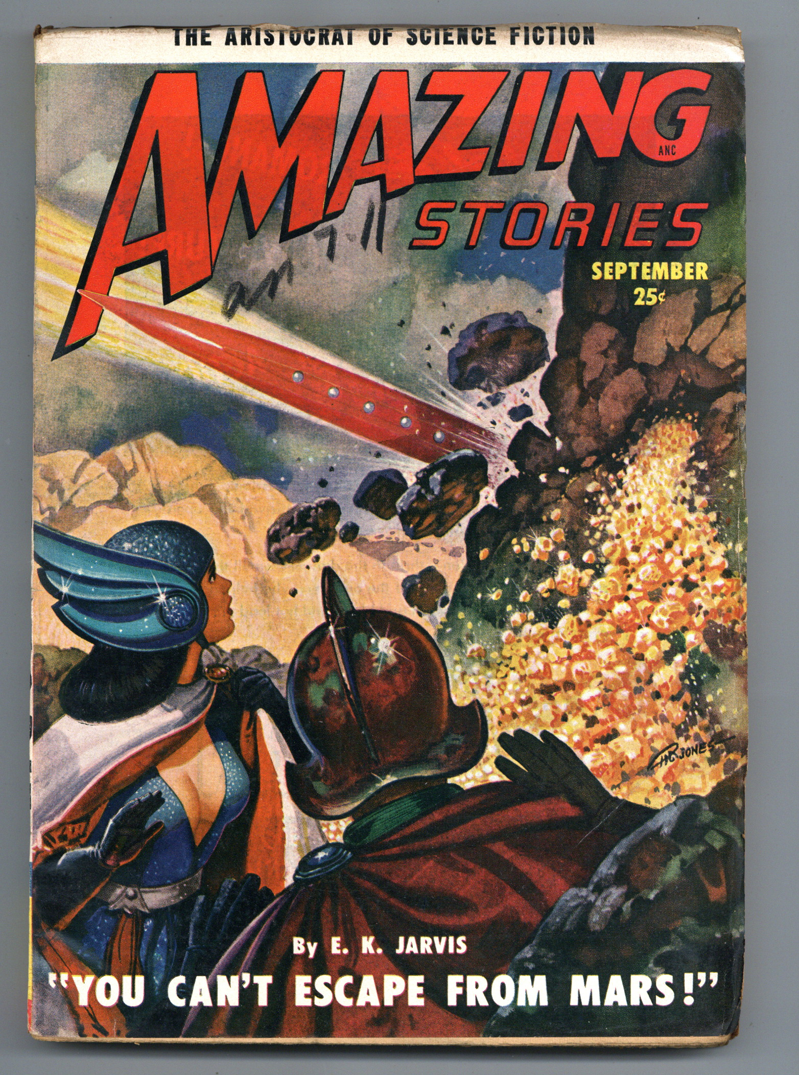 Sept 1950. Cover by Robert Gibson Jones. Science fiction stories by Robert Moore Williams, P.F. Costello, E.K. Jarvis "You Can't Escape From Mars!", Charles V. DeVet, Dallas Ross, John Wyndham, Gilbert Mead, and Gilbert Grant. Illustrations by Murphy Anderson, Harry Cronen, Rod Ruth, Julian S. Krupa, Leo Ramon Summers, and Edmond Swiatek. 7-in. x 10-in.; black and white; 176 newsprint pages. Cover price $0.25.