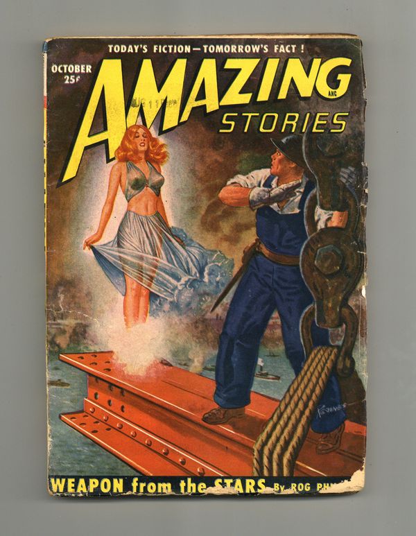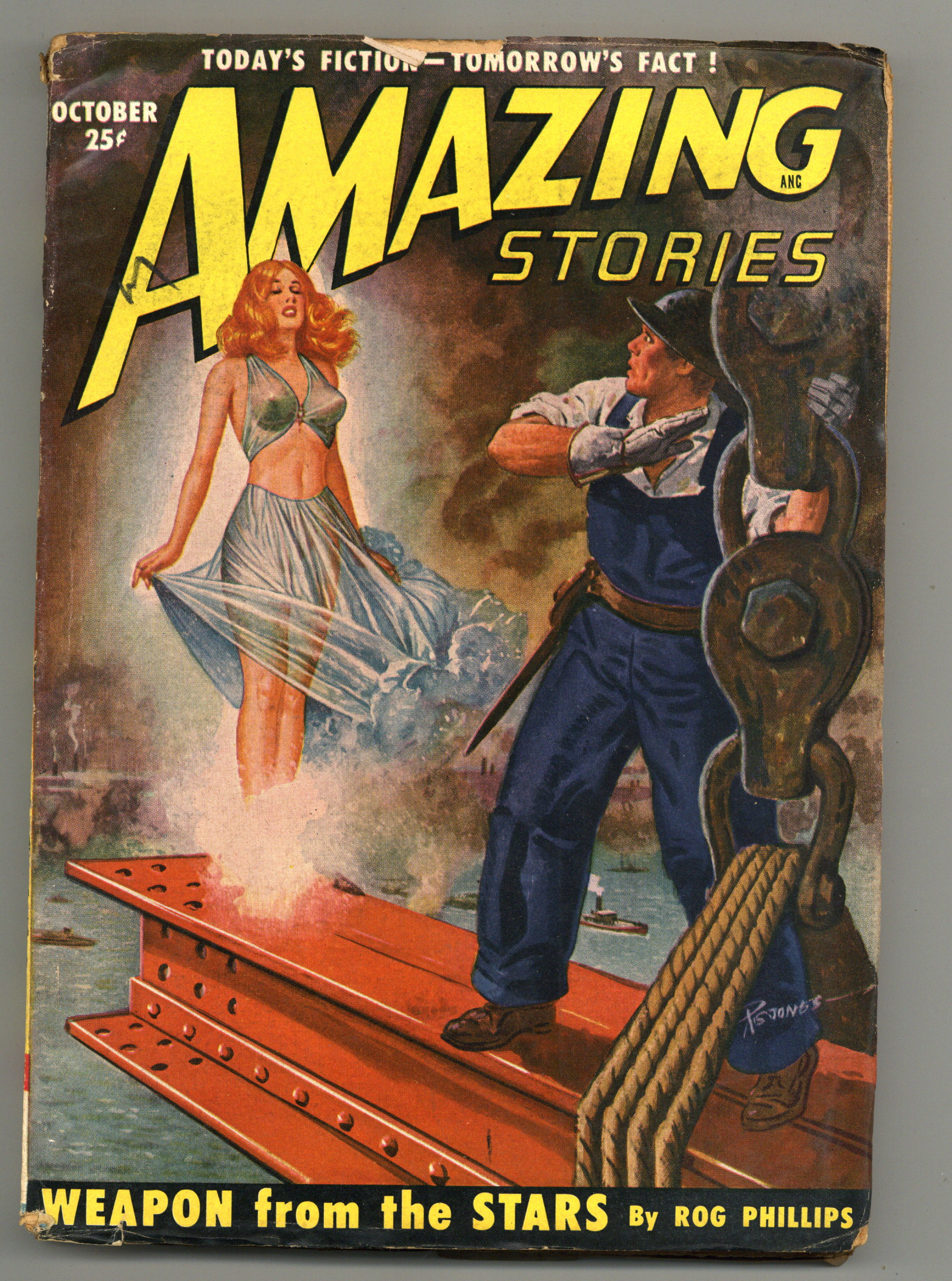 Volume 24, Issue 10 - October, 1950. Cover by Robert Gibson Jones. Science fiction stories by Rog Phillips "Weapons from the Stars", Roy B. Frentz, Alexander Blade, Walt Sheldon, Clifford D. Simak, and Fredric Brown "Gateway to Glory". Illustrations by Arthur Hutah, Enoch Sharp, Julian S. Krupa, Leo Ramon Summers, and Edmond Swiatek. 7-in. x 10-in.; black and white; 164 newsprint pages. Cover price $0.25.