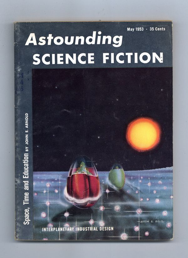 Published May 1953 by Street & Smith.$4.00May 1953. Volume 51, Issue 3 - 1st printing. Science fiction stories by Hal Clement ("Mission of Gravity" part 2), Robert Moore Williams, Algis Budrys, Irving E. Cox Jr., and Robert Sheckley. Illustrations by Dreany, Orban, Schecterson, Pawelka, and van Dongen. Article on creative engineering at M.I.T. Cover by Austin R. Baer. Softcover, 5.5-in. x 7.75-in.; 168 newsprint pages, B&W. Cover price $0.35.