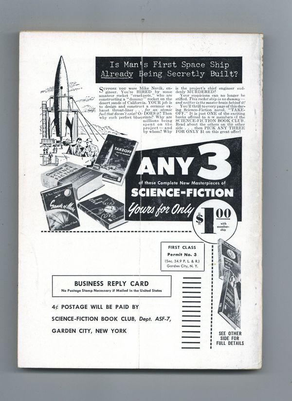July 1953. Volume 50, Issue 5 - 1st printing. Science fiction stories by Hal Clement ("Mission of Gravity" part 4), Mark Clifton and Alex Apostolides, Poul Anderson, and Don Green. Illustrations by Dreany, Miller, Orban, and van Dongen. Article on steel. Cover by Miller. Softcover, 5.5-in. x 7.75-in.; 168 newsprint pages, B&W. Cover price $0.35.