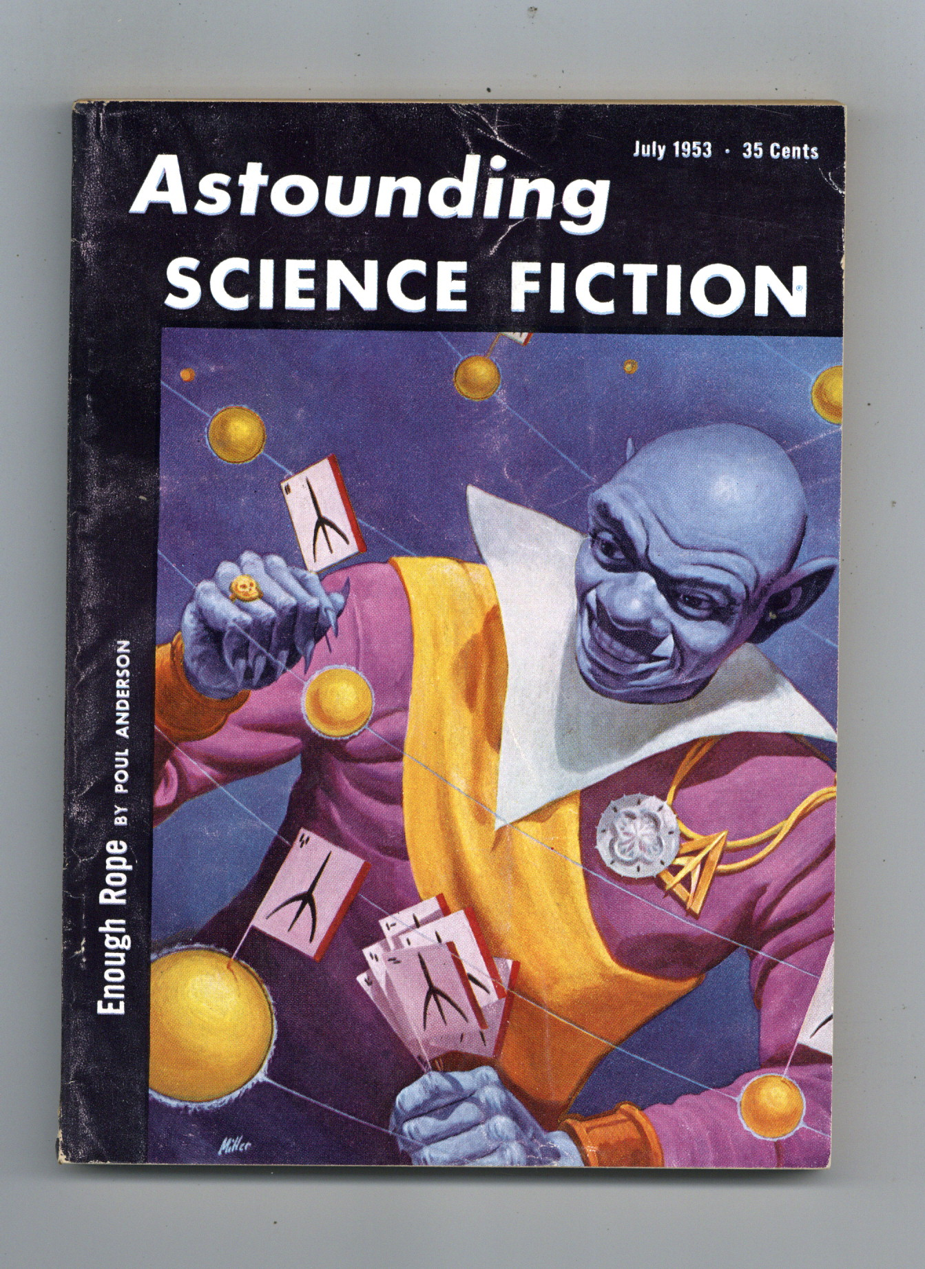 Published Jul 1953 by Street & Smith.$6.00July 1953. Volume 50, Issue 5 - 1st printing. Science fiction stories by Hal Clement ("Mission of Gravity" part 4), Mark Clifton and Alex Apostolides, Poul Anderson, and Don Green. Illustrations by Dreany, Miller, Orban, and van Dongen. Article on steel. Cover by Miller. Softcover, 5.5-in. x 7.75-in.; 168 newsprint pages, B&W. Cover price $0.35.