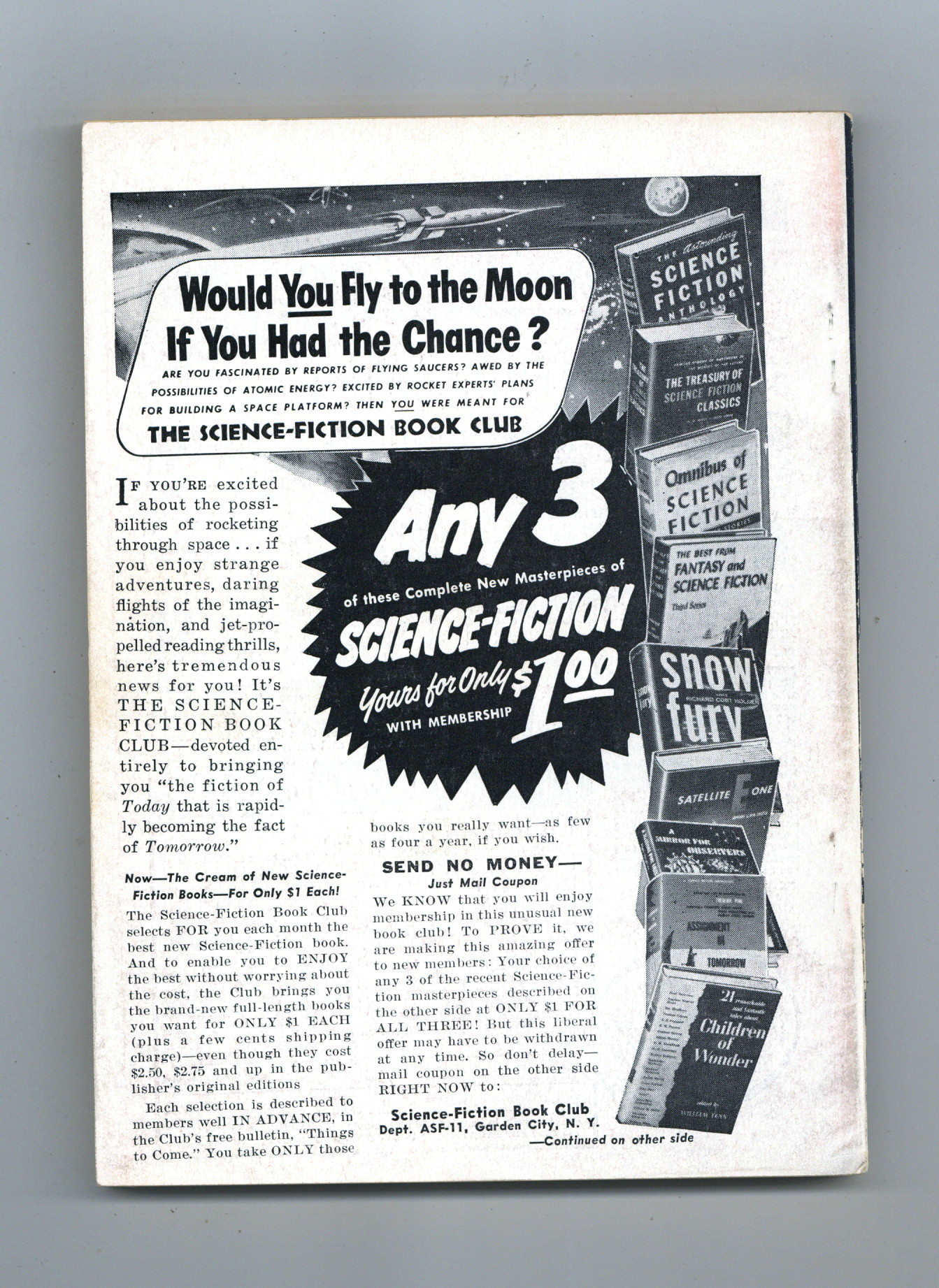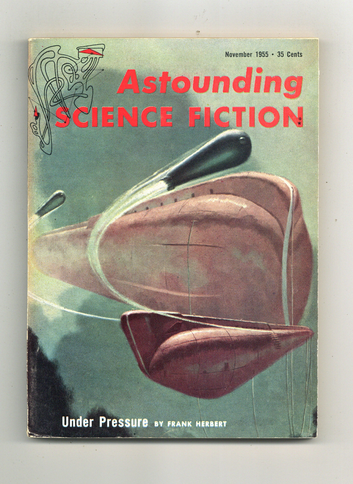 Published Nov 1955 by Street & Smith.$12.50Nov 1955. Volume 56, Issue 3 - 1st printing. Science fiction stories by Frank Herbert ("Under Pressure" part 1), Raymond F. Jones, Paul Janvier, Irving W. Lande, and Joe L. Hansley. Illustrations by Freas, Emsh, van Dongen, and Rogers. Article on moons. Cover by Van Dongen. Softcover, 5.5-in. x 7.75-in.; 160 newsprint pages, B&W. Cover price $0.35.