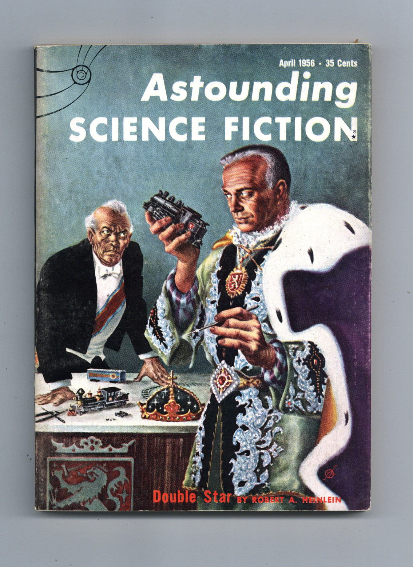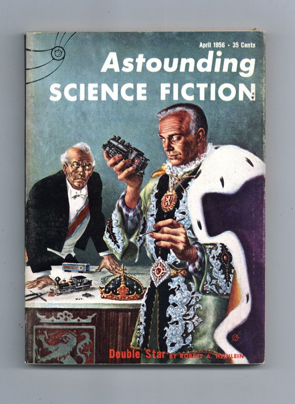 Published Apr 1956 by Street & Smith.$17.00April 1956 - Volume 57, Issue 2 - 1st printing. Science fiction stories: "The Dead Past" by Isaac Asimov, "Legwork" by Eric Frank Russell, "The Man Who Always Knew" by Algis Budrys, "Double Star"(conclusion) by Robert A. Heinlein and "The Curious Profession" by Leonard Lockhard. Illustrations by Freas and Van Dongen. Article on patents. Cover by Frank Kelly Freas. Softcover, 5.5-in. x 7.75-in.; 162 newsprint pages, B&W. Cover price $0.35.