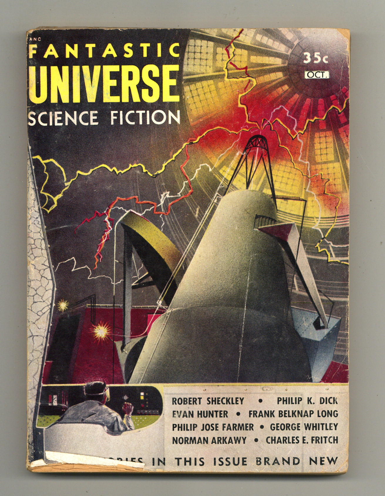 Oct 1954. Cover by Bart Lief. Science fiction stories by Philip K. Dick "Souvenir", Frank Belknap Long, Philip Jose Farmer, Robert Sheckley, Evan Hunter, George Whitley, Norman Arkawy, Charles E. Fritch, Gerda Rhoads, Carl Jacobi, Arthur T. Harris, and Gene Cross. No interior illustrations. 5.25-in. x 7.5-in.; black and white; 128 newsprint pages. Cover price $0.35.