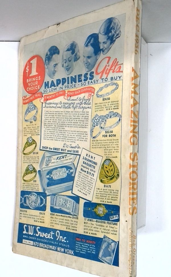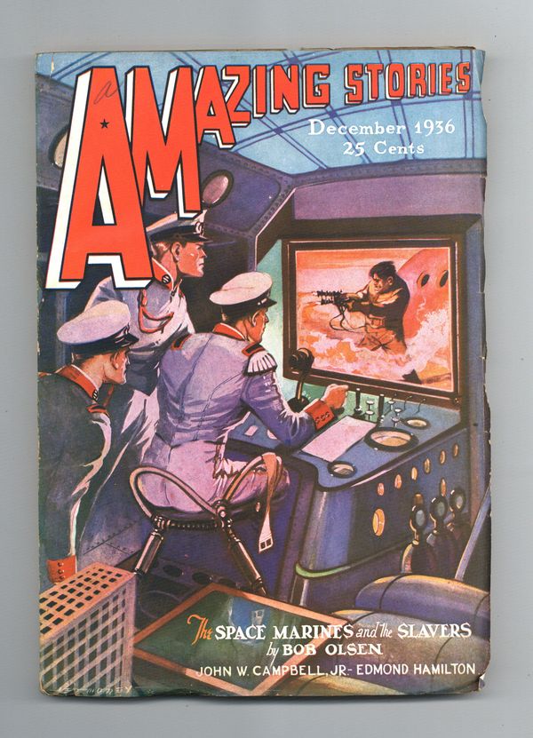 December, 1936. Cover and illustrations by Leo Morey. Science fiction stories by John W. Campbell Jr., Philip Bartel, Bob Olsen, Edmond Hamilton, Wede, and Arlyn H. Vance. 6.75-in. x 9.75-in.; black and white; 146 newsprint pages Cover price $0.25.