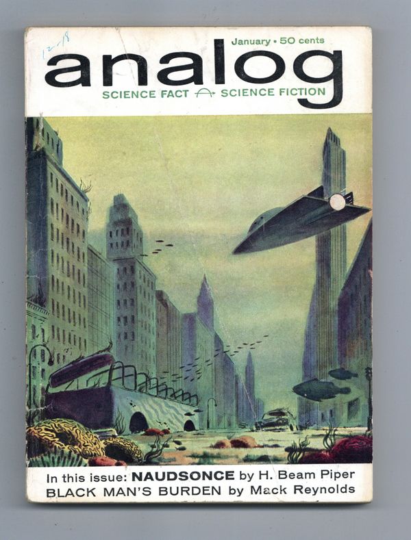 January 1962. Stories: "Black Man's Burden" (conclusion) by Mack Reynolds, "Naudsonce" by H. Beam Piper, "Worm in the Woodwork" by E.C. Tubb, and "Idiot Solvant" by Gordon R. Dickson. Science fact feature, "The Big Boom in Forming" by Willis Cain. Short review of Robert Heinlein's "Stranger in a Strange Land." Cover by Birmingham. Illustrations by Morey, Williams, Goodavage, and Schoenherr. Softcover, 5.5-in. x 7.5-in.; 178 newsprint pages, B&W. Cover price $0.50.