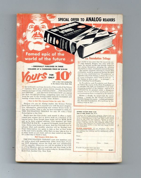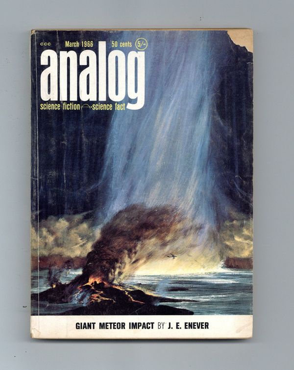 March 1966. Stories: "Bookworm, Run!" by Vernor Vinge, "Operation Malacca" by Joe Poyer, "The Ship Who Mourned" by Anne McCaffrey, "10:01 A.M." by Alexander B. Malec, and "Prototaph" by Keith Laumer. Science Fact feature, "Giant Meteor Impact" by J.E. Enever. Cover by John Schoenherr. Illustrations by Kelly Freas, Leo Summers, and John Schoenherr. Softcover, 5.5-in. x 7.5-in.; 162 newsprint pages, B&W. Cover price $0.50.