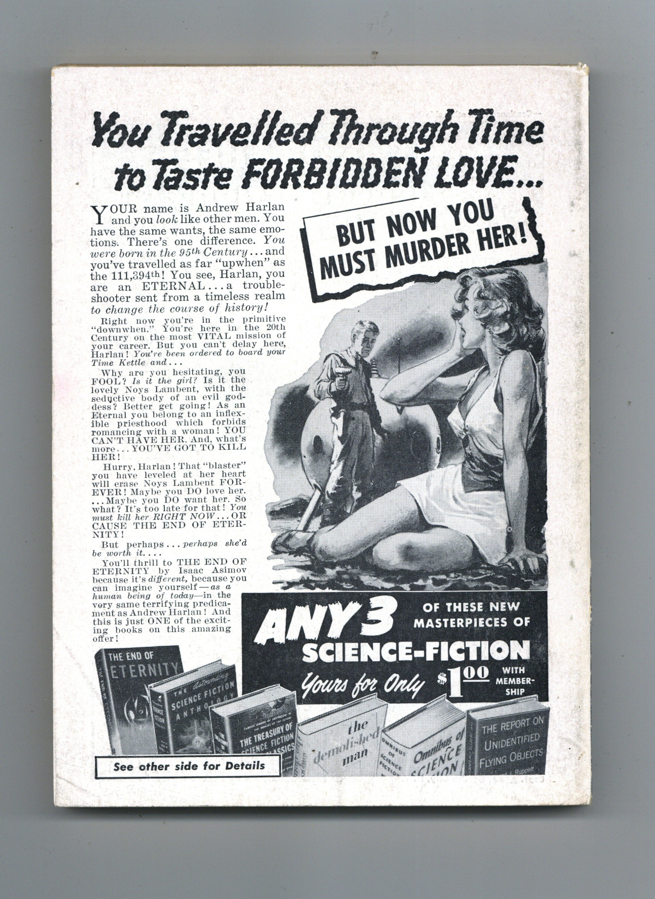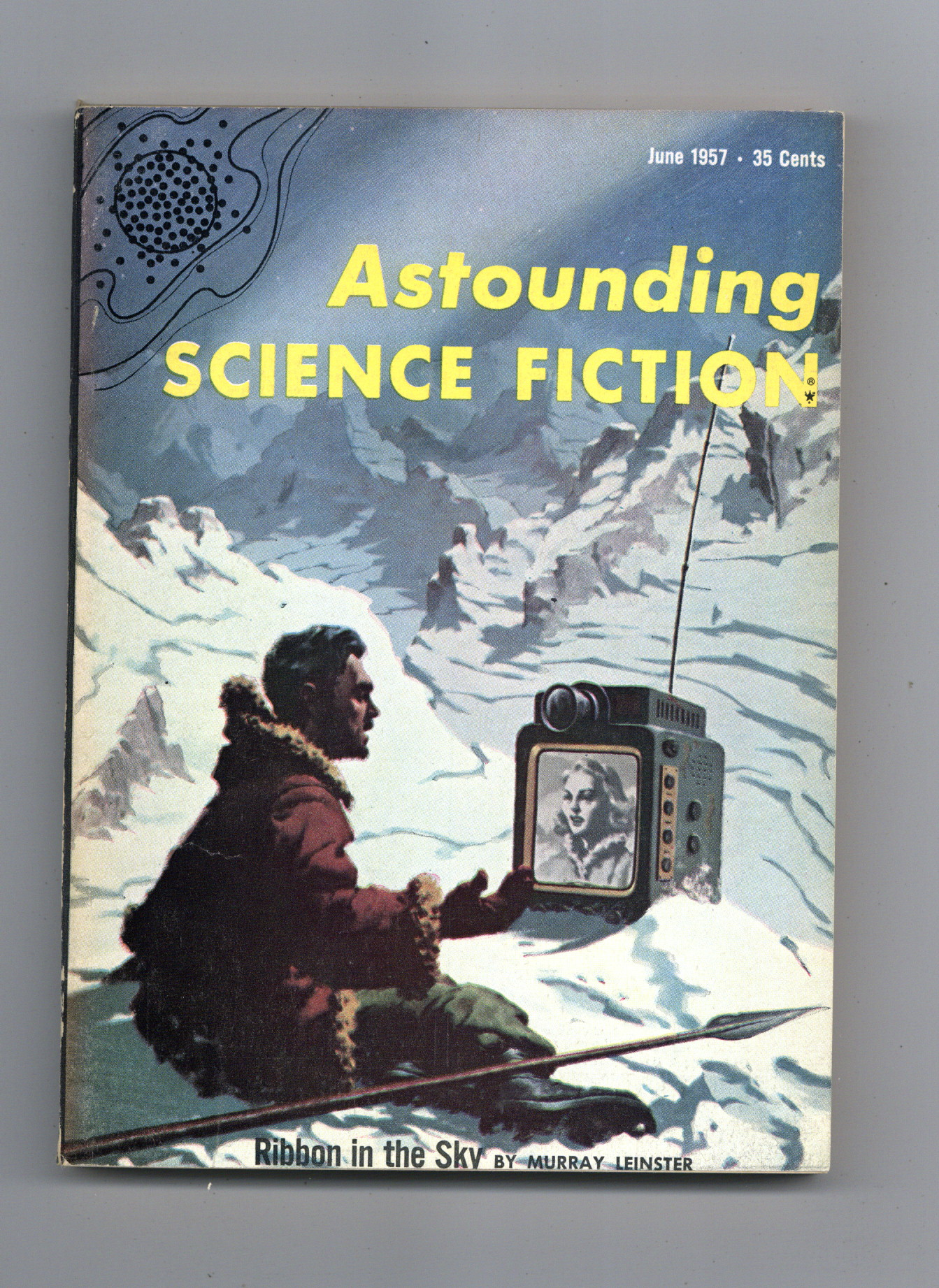 June 1957 - Volume 59, Issue 4 - 1st printing. Science fiction stories: "Ribbon in the Sky" by Murray Leinster, "Among Thieves" by Poul Anderson, "Needler" by Randall Garrett and "Drift" by A. Bertram Chandler. Illustrations by Freas, Emsh, and van Dongen. Article on Eusapia Palladino. Cover by van Dongen. Softcover, 5.5-in. x 7.75-in.; 162 newsprint pages, B&W. Cover price $0.35.