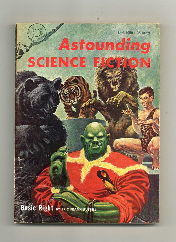 April 1958 - Volume 61, Issue 2 - 1st printing. Science fiction stories by Poul Anderson ("The Man Who Counts" conclusion), Eric Frank Russell, Christopher Anvil, and Jon Stopa. Illustrations by Freas and van Dongen. Article on science textbook errors. Cover by Freas. Softcover, 5.5-in. x 7.75-in.; 162 newsprint pages, B&W. Cover price $0.35.