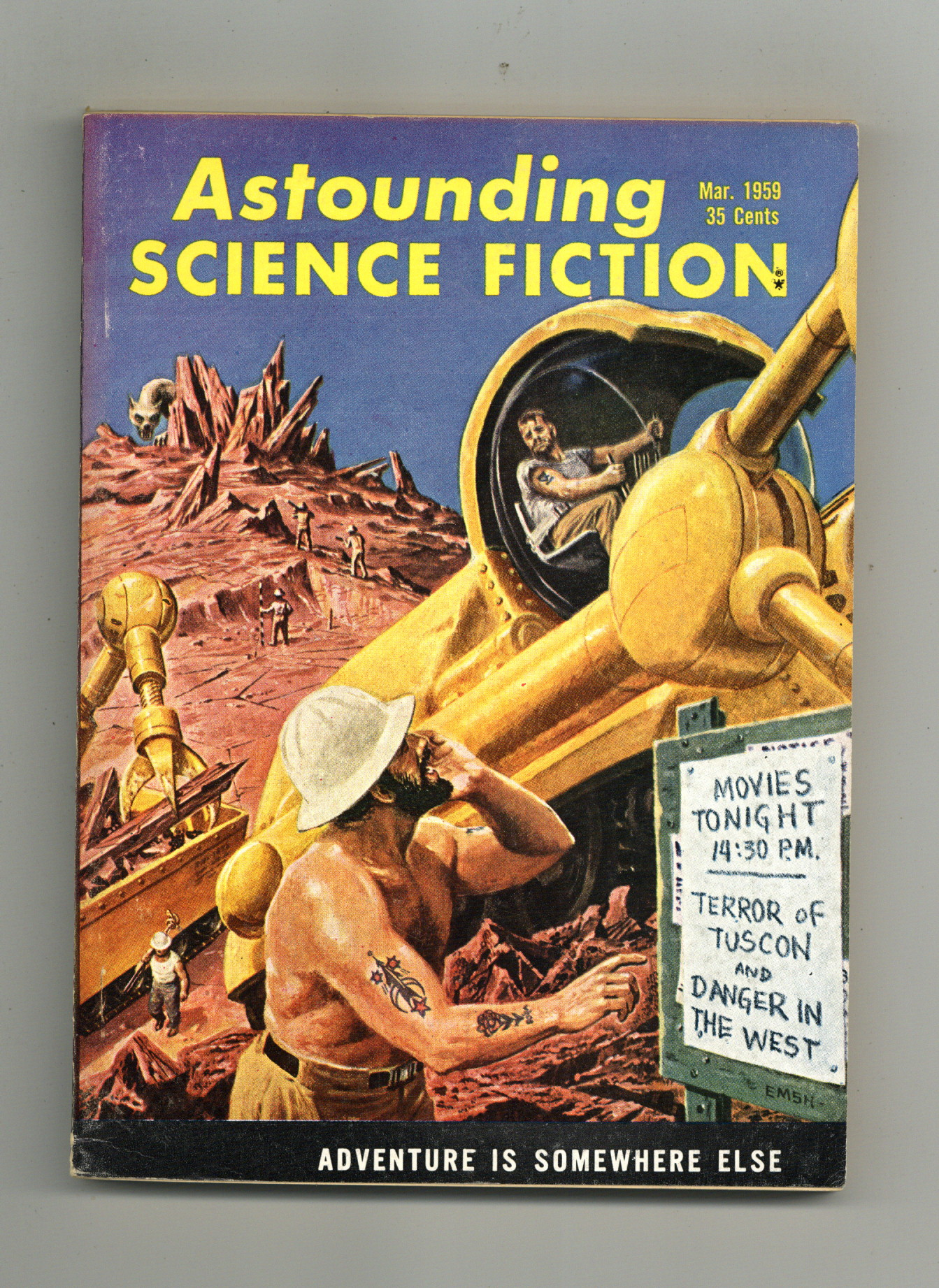 Published Mar 1959 by Street & Smith.$17.00March 1959 - Volume 63, Issue 1 - 1st printing. Science fiction stories by Murray Leinster ("The Pirates of Ersatz" part 2), David Gordon, George O. Smith, Algis Budrys, and Robert Silverberg. Illustrations by Freas, Martinez, and van Dongen. Cover by Emsh. Softcover, 5.5-in. x 7.75-in.; 162 newsprint pages, B&W. Cover price $0.35.