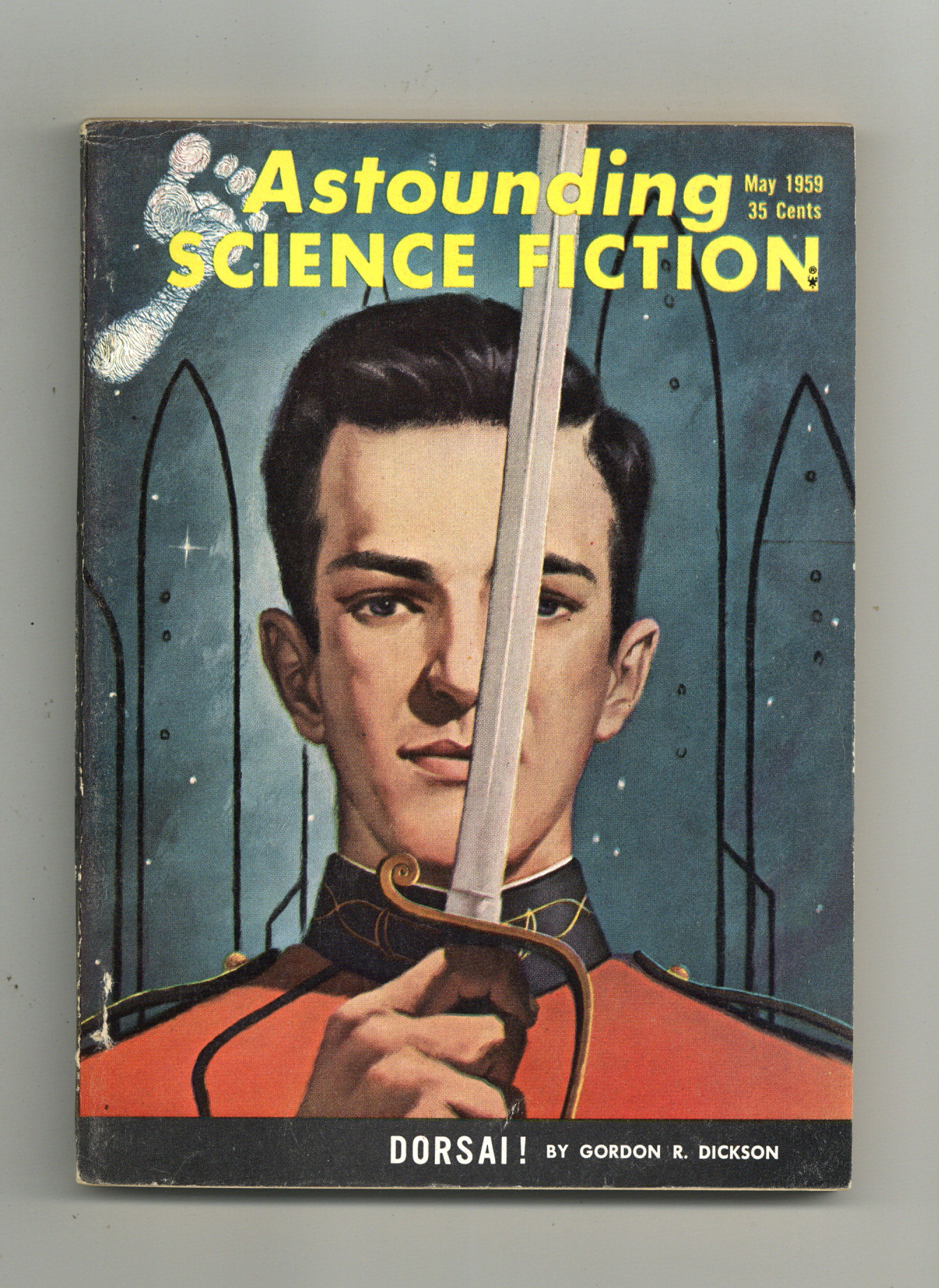 Published May 1959 by Street & Smith.$20.00May 1959 - Volume 63, Issue 3 - 1st printing. Science fiction stories by Gordon R. Dickson ("Dorsai!" part 1), David Gordon, Frank Herbert, Larry M. Harris, Roger Kuykendall, George O. Smith, and Philip Latham. Illustrations by Freas, Emsh, Martinez, van Dorgen, and Summers. Cover by van Dongen. Softcover, 5.5-in. x 7.75-in.; 162 newsprint pages, B&W. Cover price $0.35.