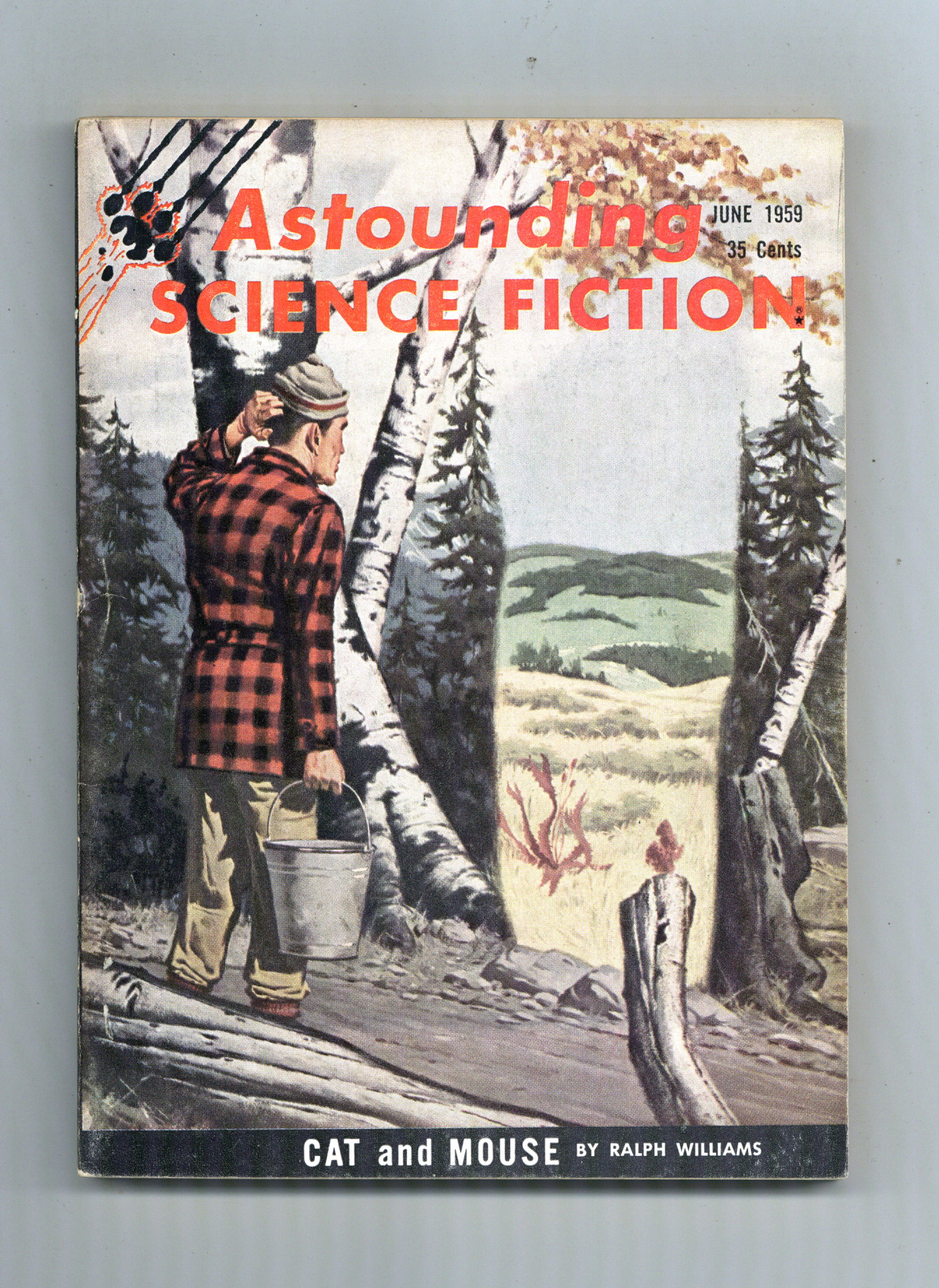 Published Jun 1959 by Street & Smith.$20.00June 1959 - Volume 63, Issue 4 - 1st printing. Science fiction stories by Gordon R. Dickson ("Dorsai!" part 2), Ralph Williams, Chad Oliver, Roger Kuykendall, and Mack Reynolds. Illustrations by Freas and van Dorgen. Short review of Ray Bradbury's "A Medicine for Melancholy." Cover by van Dongen. Softcover, 5.5-in. x 7.75-in.; 162 newsprint pages, B&W. Cover price $0.35.