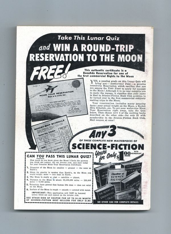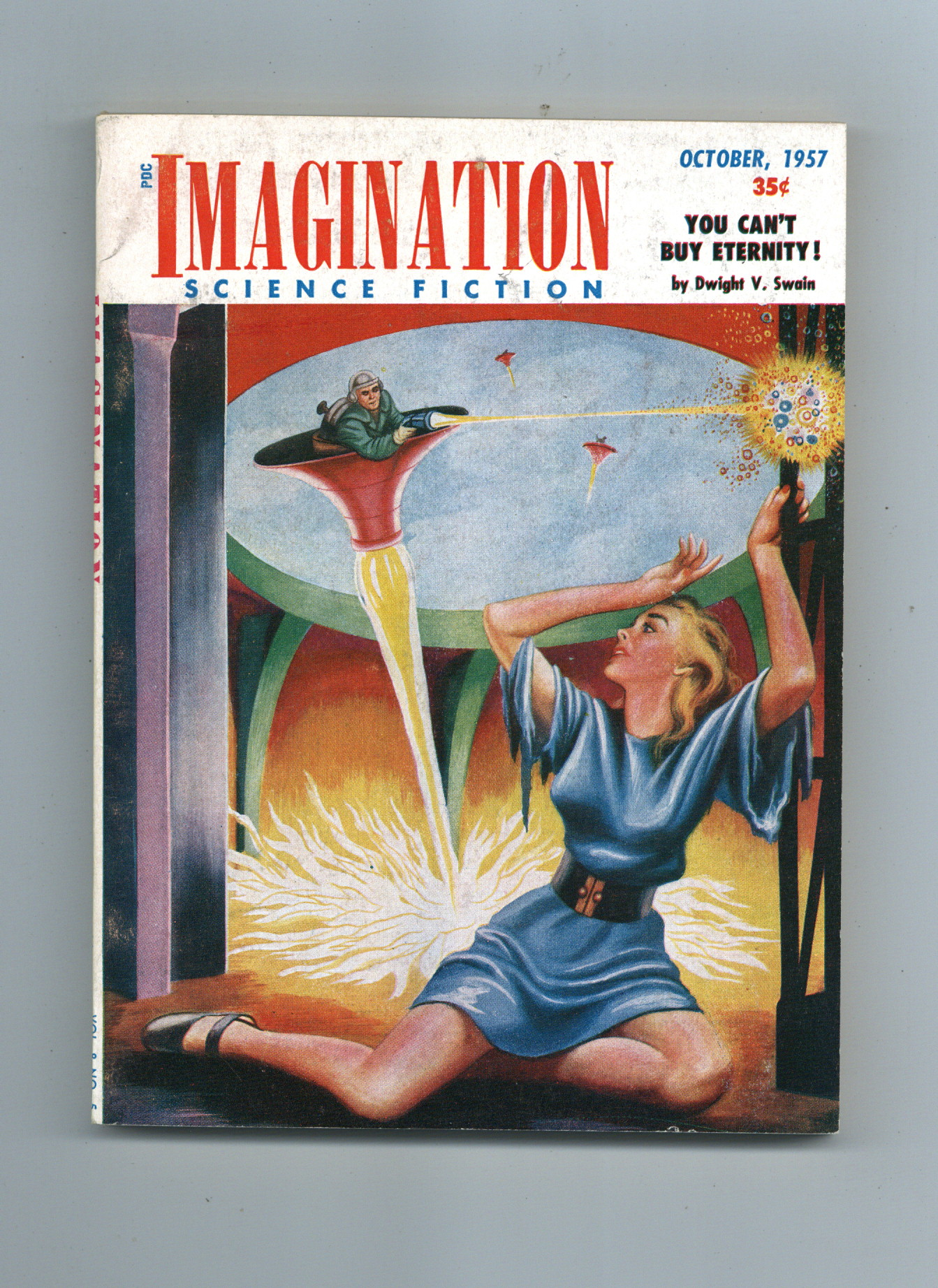 Published Oct 1957 by Greenleaf Publishing.$42.50October 1957. Science fiction stories: "You Can't Buy Eternity!" by Dwight V. Swain, "John Holder's Weapon" by Robert Moore Williams, "The Mannion Court-Martial" by Randall Garrett, "Overlord of Colony Eight" by Robert Silverberg, "The Ambassador's Pet" by Alexander Blade, and "Barnstormer" by Tom W. Harris. Cover by Lloyd Rognan. 5-3/8 in. x 7-1/4 in; black and white; 128 pages. Cover price $0.35.