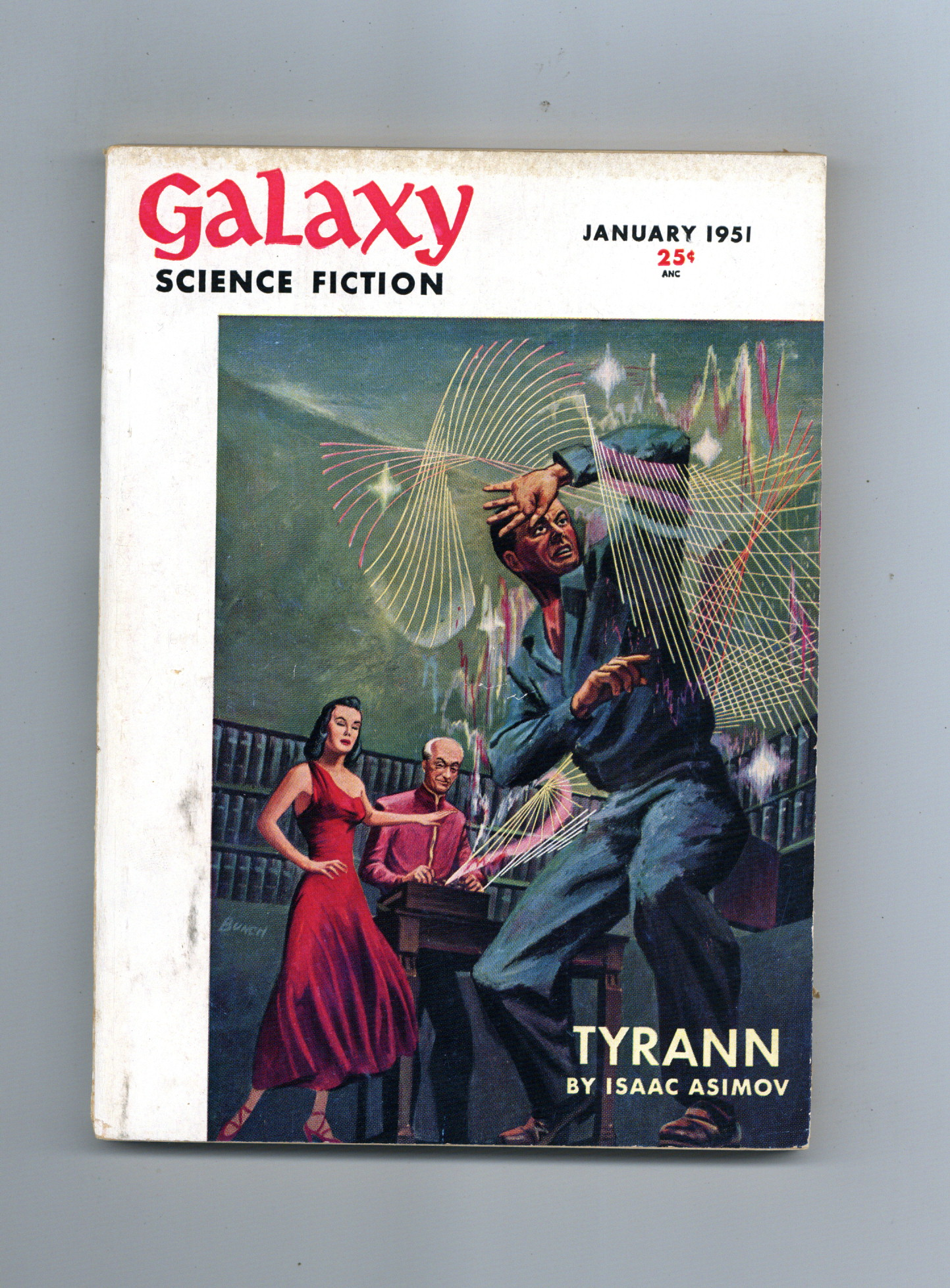 Published Jan 1951 by Galaxy Publications.$6.00January 1951. Cover by John Bunch. Stories: "Tyrann"(Part 1) by Isaac Asimov, "Rule of Three" by Theodore Sturgeon, "Made to Measure" by William Campbell Gault, "The Reluctant Heroes" by Frank M. Robinson, "Dark Interlude" by Mack Reynolds and Fredric Brown, and "Susceptibility" by John D. MacDonald. 5.25-in. x 7.5-in.; 160 Pages, B&W. Cover price $0.25.