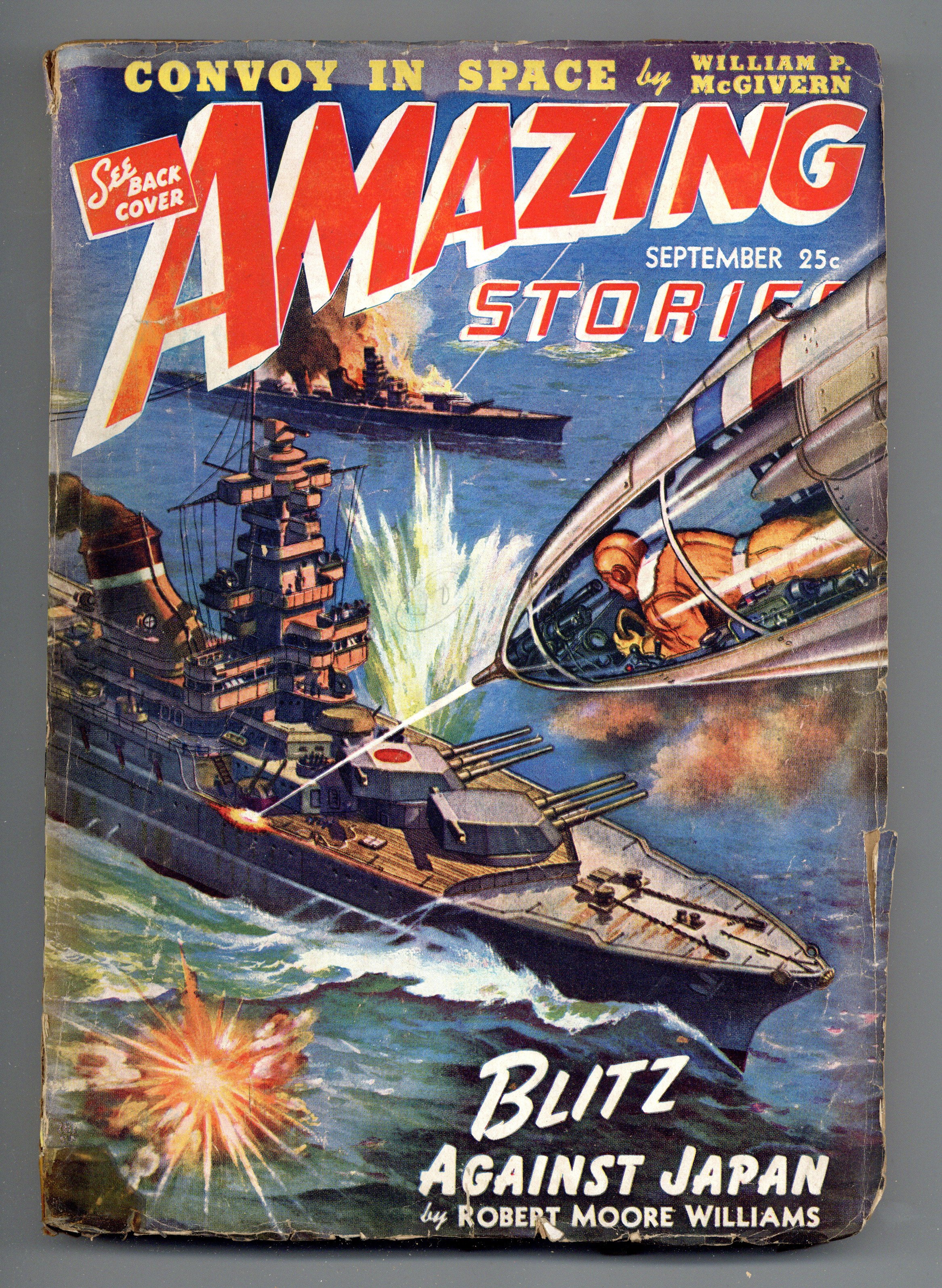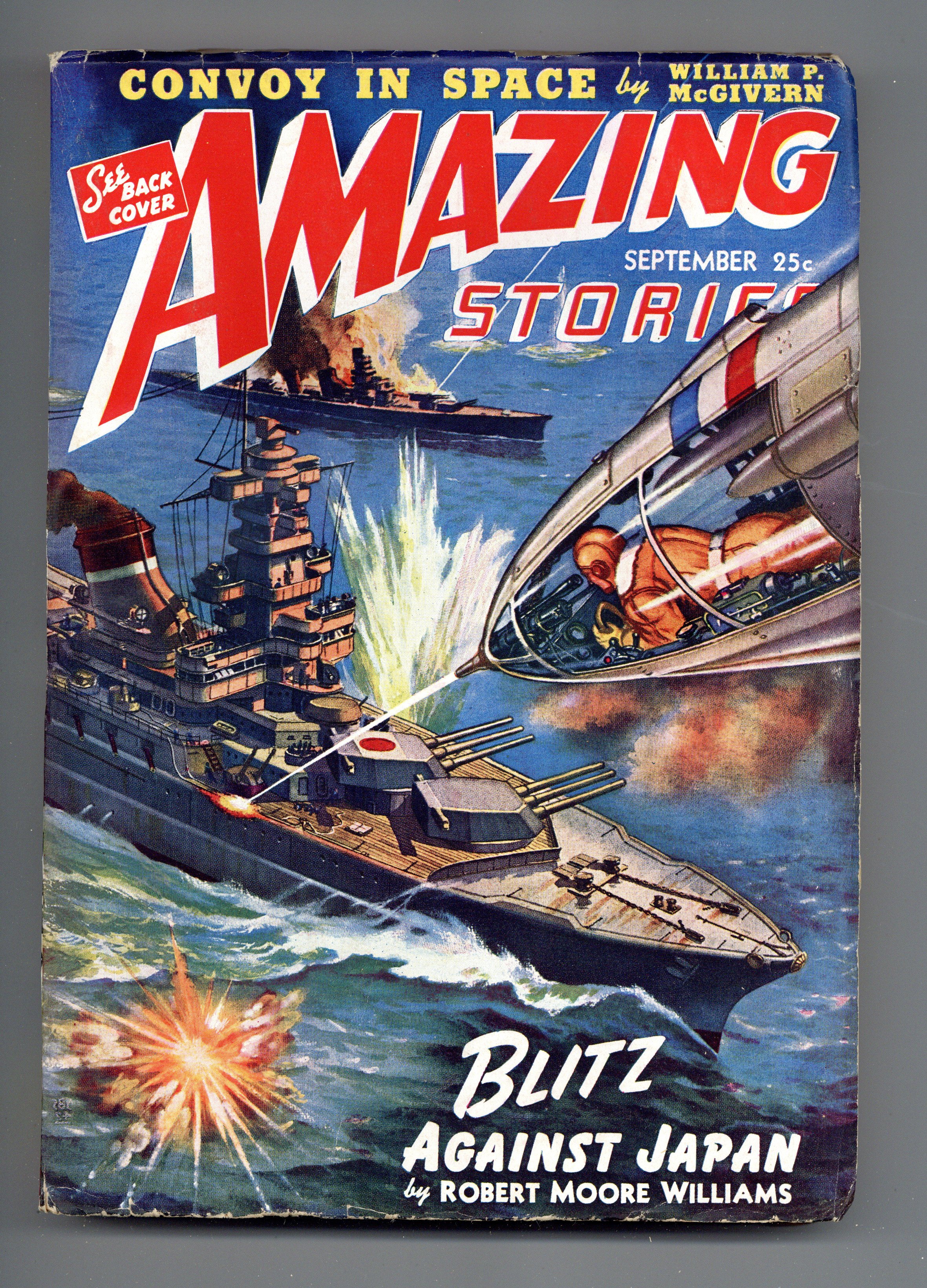 Sept 1942. Frond and back cover by James B. Settles. Stories by Robert Moore Williams "Blitz Against Japan", Nelson S. Bond, Gerald Vance, E. K. Jarvis, William P. McGivern, P. F. Costello, Max Overton, Dwight V. Swain, and G. H. Irwin. Illustrations by Robert Fuqua, Ned Hadley, L. Raymond Jones, R. B. Sharp, Brady, Russell Milburn, H. W. McCauley, Joe Sewell, and Hugo Wolf. 7" x 10"; black and white with color cover; 240 newsprint pages. Cover price $0.25.