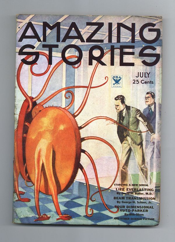 July 1934. Cover and illustrations by Leo Morey. Science fiction stories by David H. Keller, Milton R. Peril, Jules Verne ("Measuring a Meridian" part 3 of 4), George H. Scheer, Bob Olsen, and Charlie Mills. 7" x 9.75"; black and white; 144 newsprint pages. Cover price $0.25.