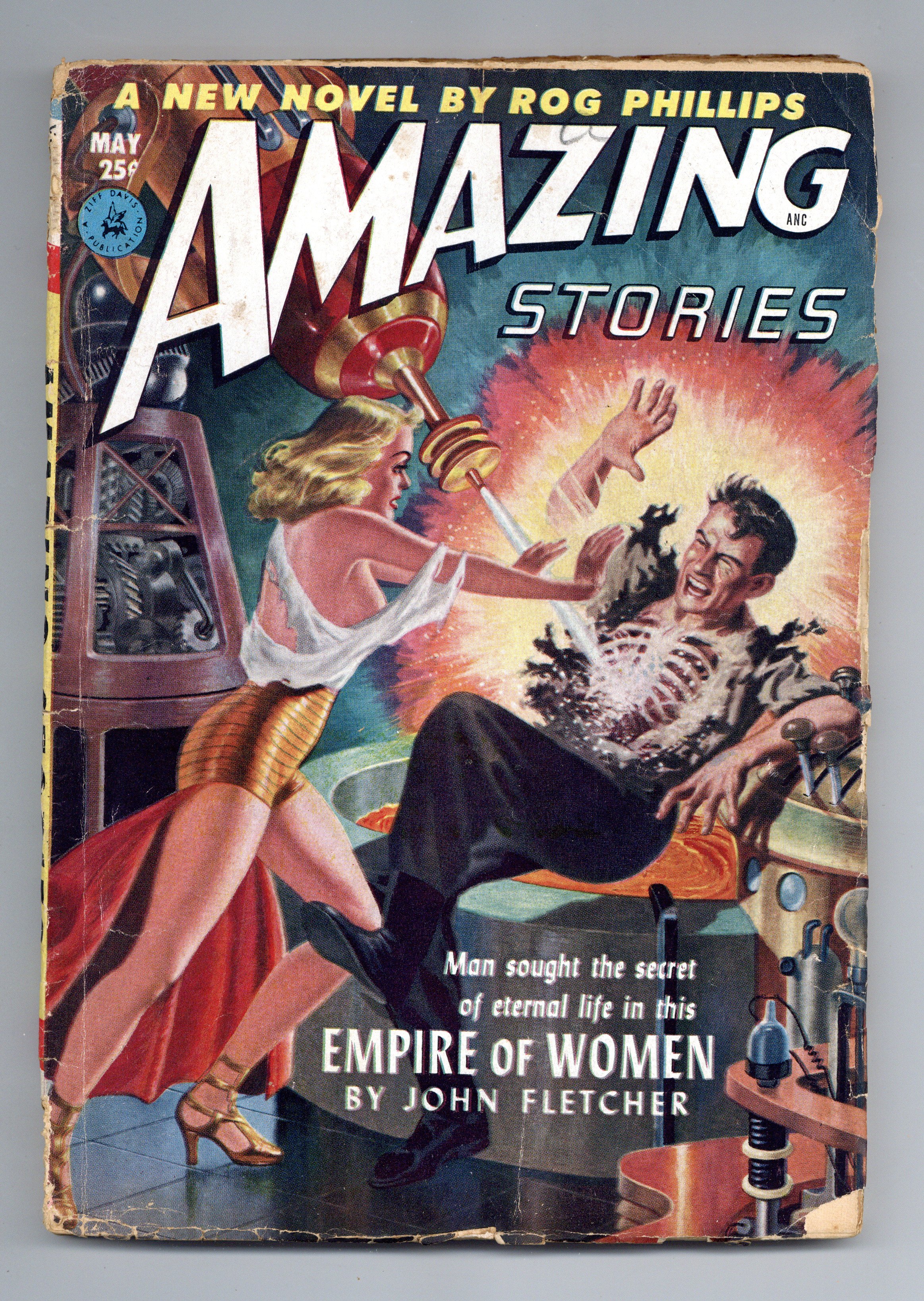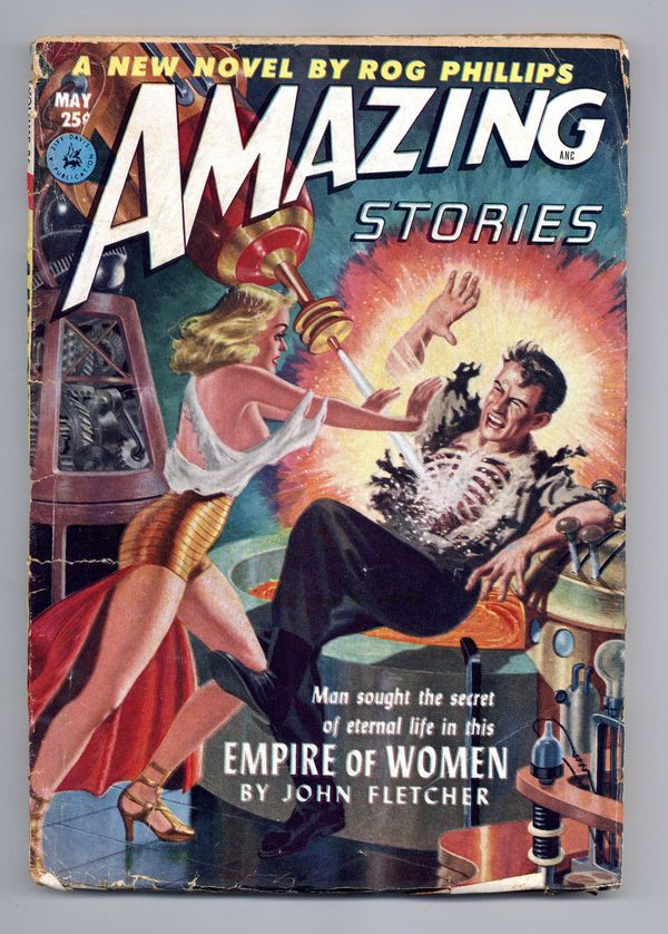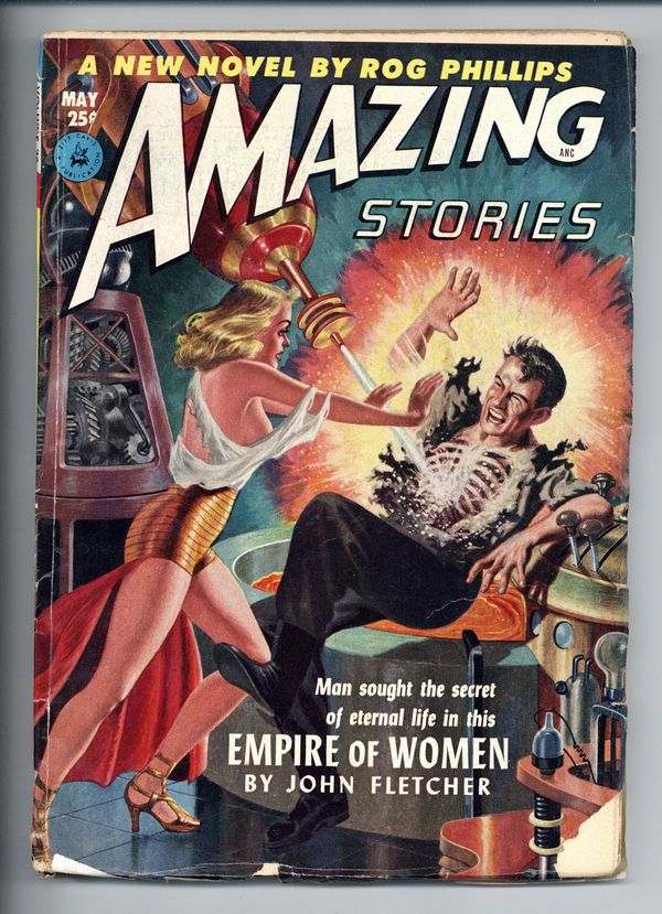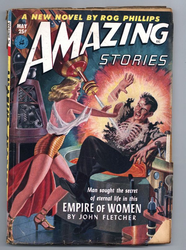 Volume 26, Issue 5 - May, 1952. Cover by Lawrence Stevens, suggested by a scene from "Empire of Women" by John Fletcher. Stories by John Fletcher, F. Willard Grey, Rog Phillips, Gerald Vance and unknown. Illustrations by Leo Ramon Summers, Ed Valigursky, Lawrence Stevens, Virgil Finlay and Tom Beecham. Stories: "Empire of Women" by John Fletcher, illustrated by Leo Ramon Summers and Ed Valigursky; "Come to Venus -- and Die!" by F. Willard Grey, illustrated by Lawrence Stevens; "The World of Whispering Wings" by Rog Phillips, illustrated by Virgil Finlay; "Monkey in the Ice Box" by Gerald Vance, illustrated by Tom Beecham; and "Master of the Universe" by unknown author, illustrated by Ed Valigursky. Features: The Observatory; What's All This "Vector" Business?; Errors Make Perfection; Science Fiction Bookcase; The Reader's Forum; Television in the Can; Routine Patrol; and more. 7-in. x 10-in., 164 newsprint pages, B&W. Cover price $0.25.