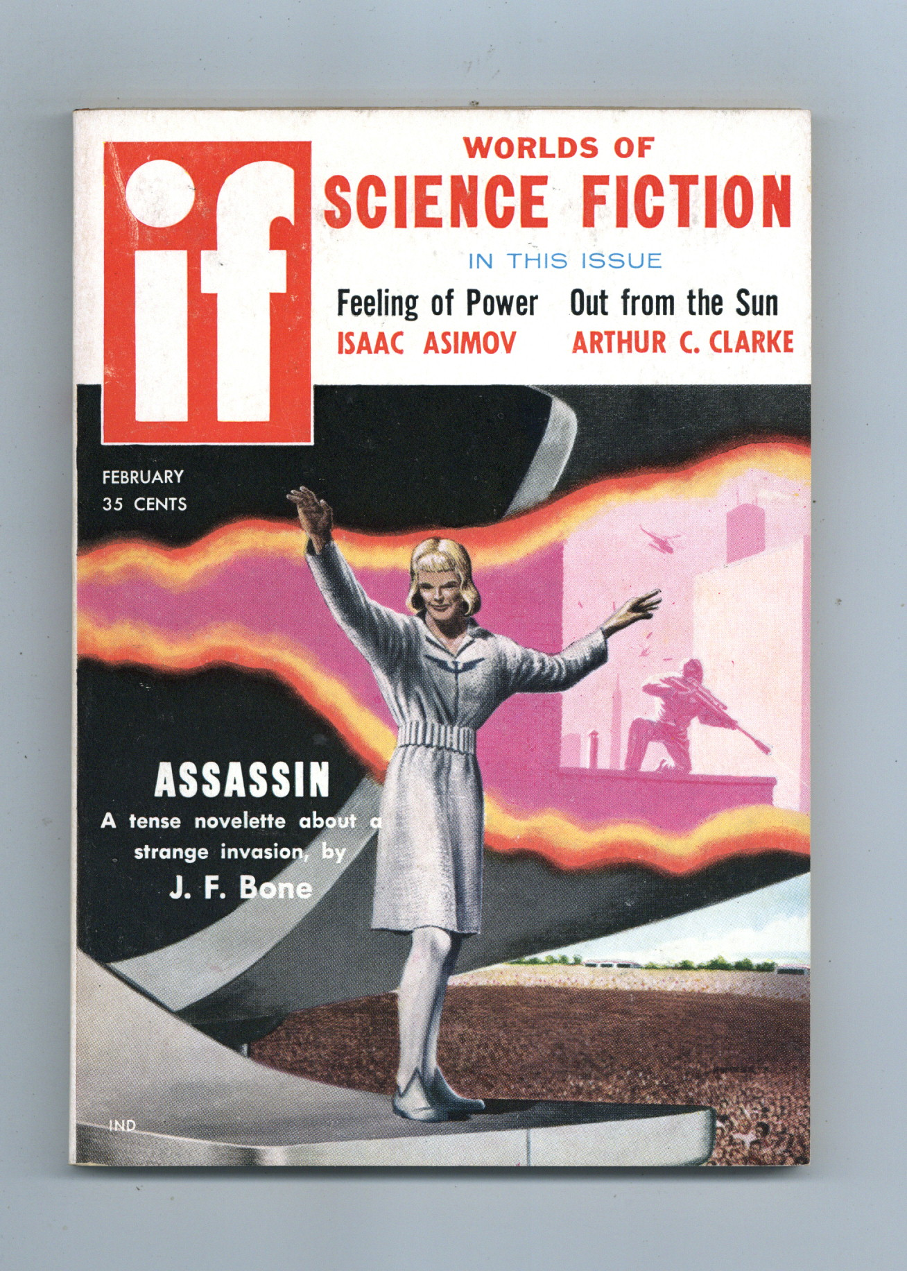 February 1958. Cover by Mel Hunter. Stories: "Assassin" by J. F. Bone, "The Barbarians" by John Sentry, "The Feeling of Power" by Isaac Asimov, "The Hero" by Elaine Wilber, "Contamination Crew" by Alan E. Nourse, "Out From the Sun" by Arthur C. Clarke, "Security Risk" by Ed M. Clinton, Jr., "The Standardized Man" by Stephen Bartholomew, and "Feet of Clay" by Philip Hoskins. 5.25-in. x 7.5-in.; 120 Pages, B&W. Cover price $0.35.