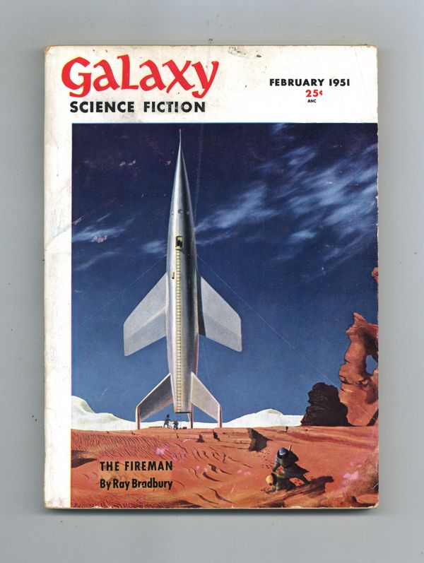 Published Feb 1951 by Galaxy Publications.$155.00Features the first publication of "The Fireman" by Ray Bradbury (later expanded into the novel Fahrenheit 451). Cover by Chesley Bonestell. Stories: "The Fireman" by Ray Bradbury, "...And it Comes Out Here" by Lester Del Rey, "The Protector" by Betsy Curtis, "Second Childhood" by Clifford D. Simak, "Two Weeks in August" by Frank M. Robinson, and "Tyrann"(Part 2) by Isaac Asimov. 5.25-in. x 7.5-in.; 160 Pages, B&W. Cover price $0.25.