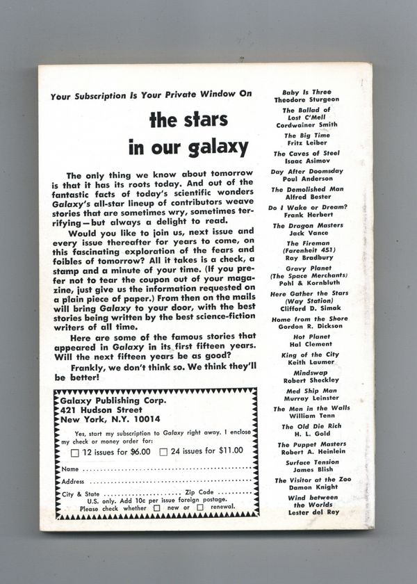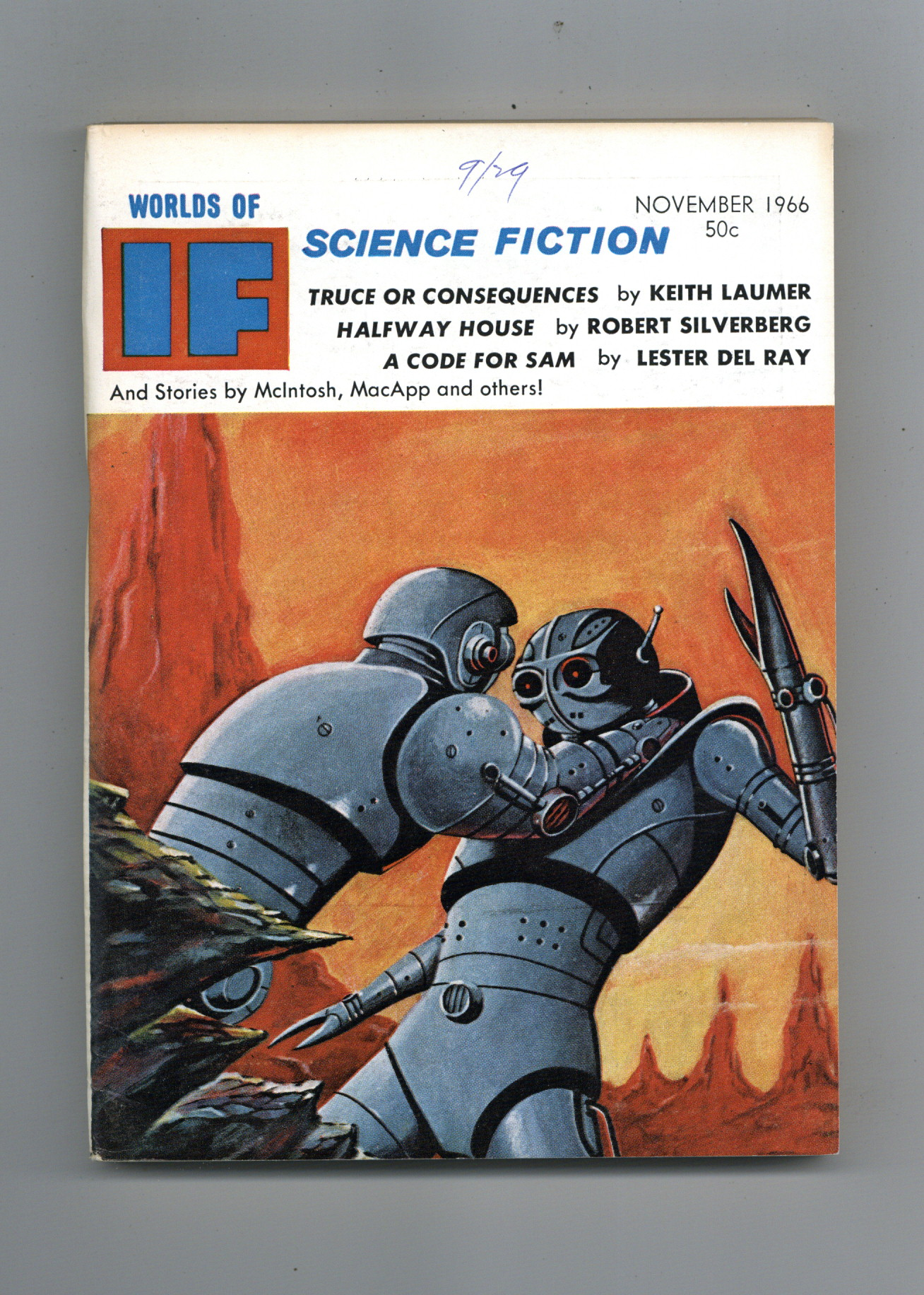 November 1966. Cover by Adkins. Stories: "Truce or Consequences" by Keith Laumer, "At the Core" by Larry Niven, "The Sign of Gree" by C. C. MacApp, "A Code for Sam" by Lester Del Rey, "Snow White and the Giants"(Part 2) by J. T. McIntosh, "The Babe in the Oven" by John T. Sladek, "Halfway House" by Robert Silverberg, "Hairry" by Mike Hill, and "The Boat in the Bottle" by Thurlow Weed. 5.25-in. x 7.5-in.; black and white; 130 newsprint pages. Cover price $0.50.