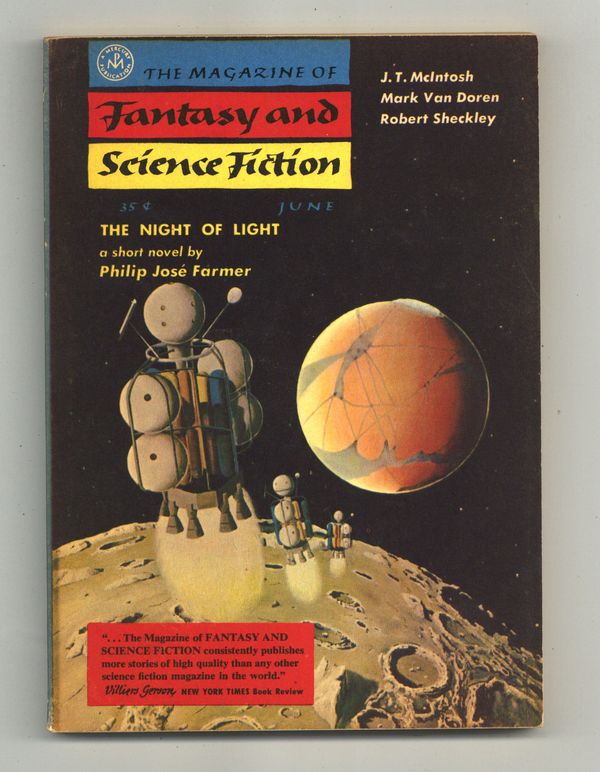 Published Jun 1957 by Mercury Publications.$5.60June 1957. Cover by John Pederson. Fantasy and science fiction stories: "The NIght of Light" by Philip Jose Farmer, "The Little Place" by Mark Van Doren, "Rescue" by G.C. Edmondson, "Love, Inc." by Robert Sheckley, "The Science Screen and Stage" by Charles Beaumont and William Morrison, "Moonshine" by Ruth M. Goldsmith, "The Sandman" by J.T. McIntosh, "Dodger Fan" by Will Stanton, "Security Check" by Arthur C. Clarke", "The Cage" by Bertram Chandler. Softcover, 5.5-in. x 7.5-in.; 128 newsprint pages, B&W. Cover price $0.35.