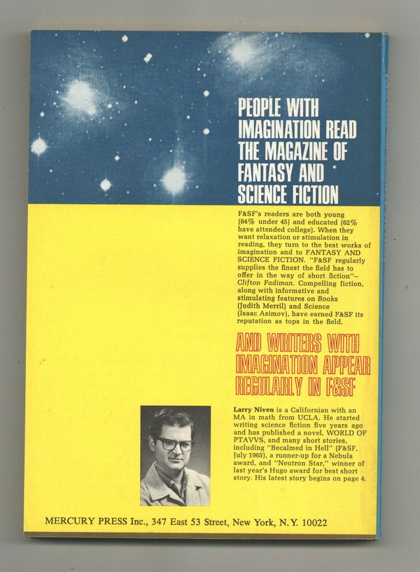 Published Oct 1968 by Mercury Publications.$32.00October 1968. Cover by Ronald Walotsky. Fantasy and science fiction stories: "The Meddler" by Larry Niven, "The Fangs of the Trees" by Robert Silverberg, "Time Was" by Phyllis Murphy, "The Wide World of Sports" by Harvey Jacobs, "Coffee Break" by D.F. Jones, "Try A Dull Knife" by Harlan Ellison, "Segregationist" by Isaac Asimov, "The Ghost Patrol" by Ron Goulart, "Possible, That's All!" by Arthur C. Clarke, Monthly essay "Books" by Robert J. Hughes and Ted White, "Dance Music For A Gone Planet" by Sonya Dorman, "Science: Little Found Satellite" by Isaac Asimov. Softcover, 5-in. x 7-in., 130 newsprint pages, B&W. Cover price $0.50.
