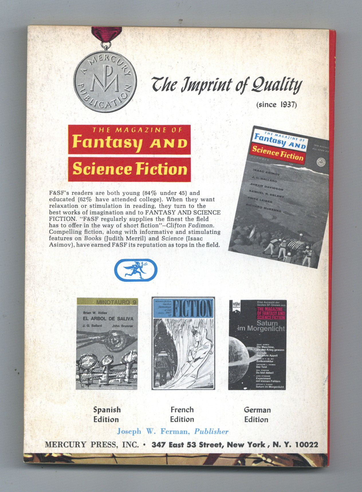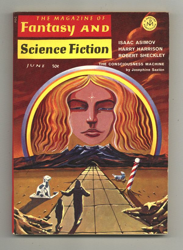 Published Jun 1968 by Mercury Publications.$7.60June 1968. Cover by Ronald Walotsky. Fantasy and science fiction stories: "The Consciousness Machine" by Josephine Saxton, "Sea Home" by William M. Lee, "The People Trap" by Robert Sheckley, "Settle" by Ann Macleod, "Backtracked" by Burt Filer, "At the Heart of It" by Michael Harrison, "The Secret of Stonehenge" by Harry Harrison, "Of Time and Us" by David R. Bunch, Monthly essay "Books" by Judith Merril, "Science: Counting Chromosomes" by Isaac Asimov. Softcover, 5-in. x 7-in., 130 newsprint pages, B&W. Cover price $0.50.