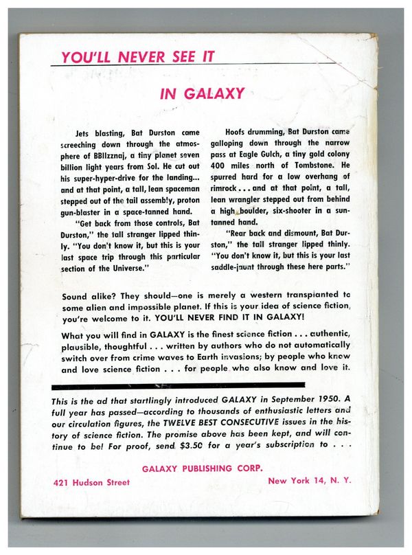 Published Oct 1951 by Galaxy Publications.$6.00- Back cover detached 10%.
