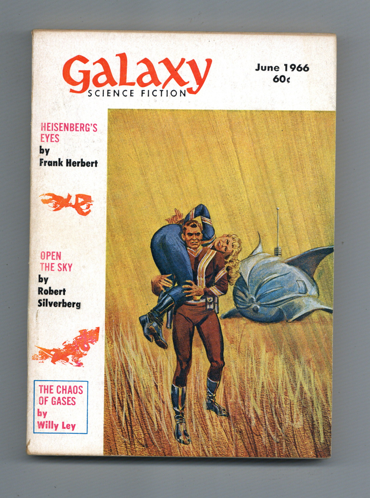 Published Jun 1966 by Galaxy Publications.$5.00June 1966. Cover by Morrow. Stories: "The Eskimo Invasion" by Hayden Howard, "Open Sky" by Robert Silverberg, "Heisenberg's Eyes"(Part 1) by Frank Herbert, "Priceless Possession" by Arthur Porges, and "When I Was Miss Dow" by Sonya Dorman. Non-Fact Articles: "Galactic Consumer Report No. 2: Automatic Twin-Tube Wishing Machine" by John Brunner. 5.25-in. x 7.5-in.; 194 Pages, B&W. Cover price $0.60.
