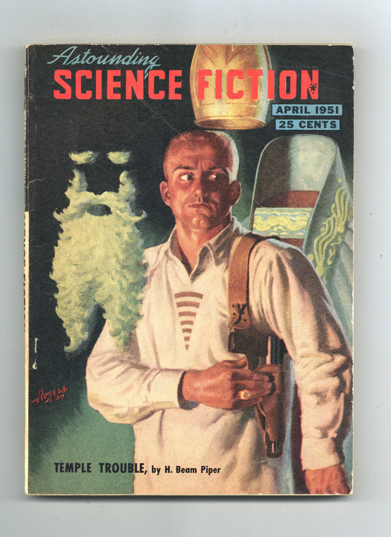 Published Apr 1951 by Street & Smith.$4.00April 1951. Cover by Hubert Rogers. Stories: "Temple Trouble" by H. Beam Piper, "A Stitch in Time" by Sylvia Jacobs, "The Peddler's Nose" by Jack Williamson, "The Weapon" by Fredric Brown, "Dog" by Oliver Saari, and "Prodigal's Aura. Articles: "Probabilities and Punctures" by Milton A. Rothman, and "Wanted--Help" by R. S. Richardson. Softcover, 5.5-in x 7.75-in, 162 Pages, B&W. Cover price $0.25.