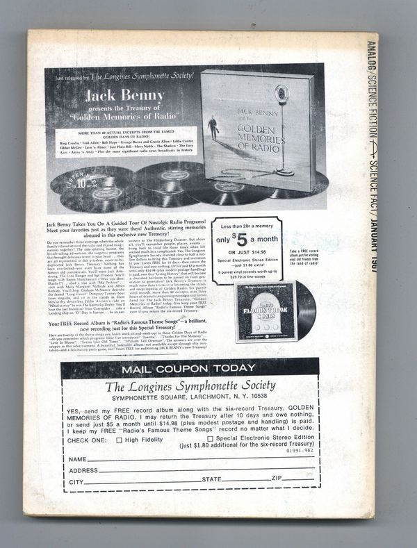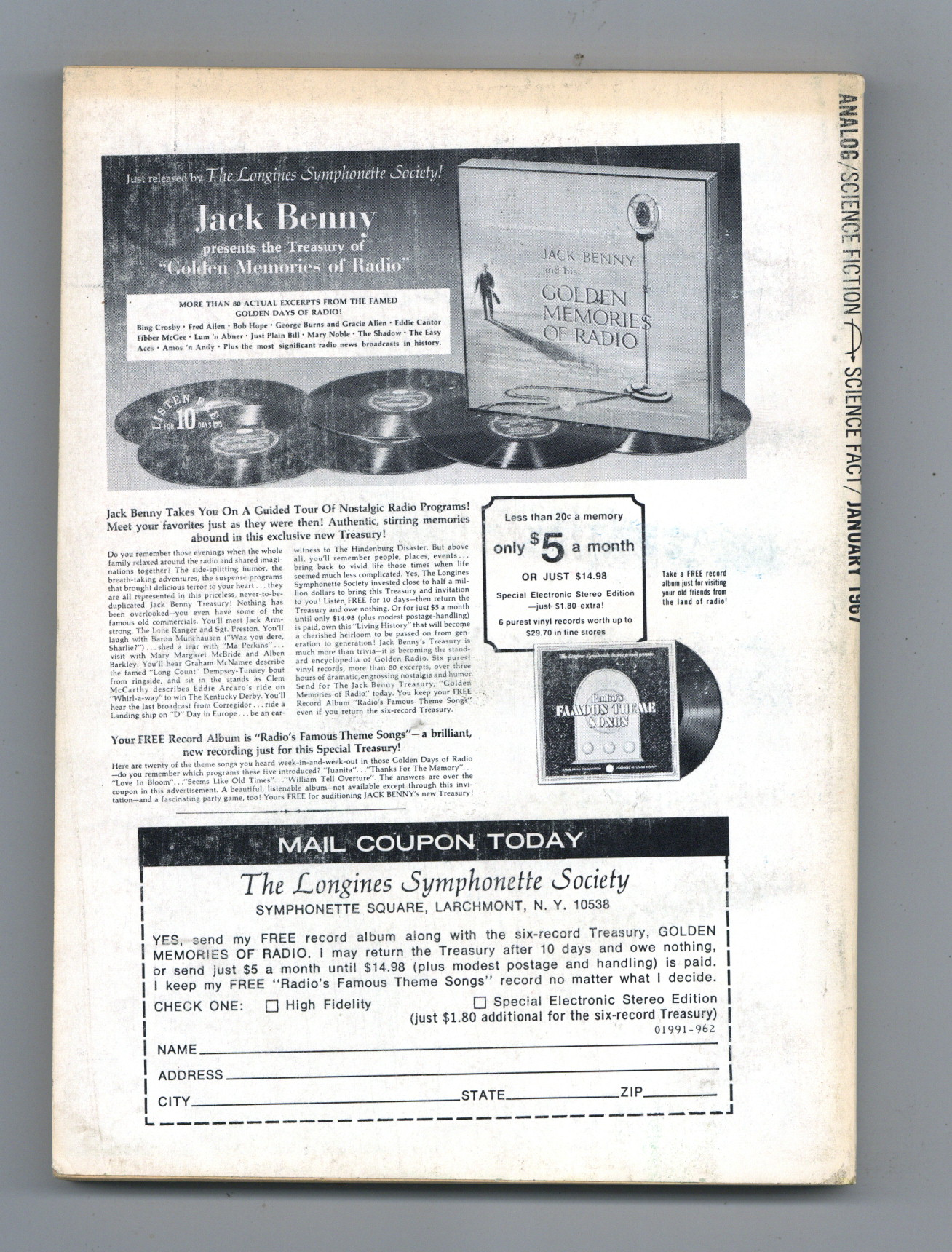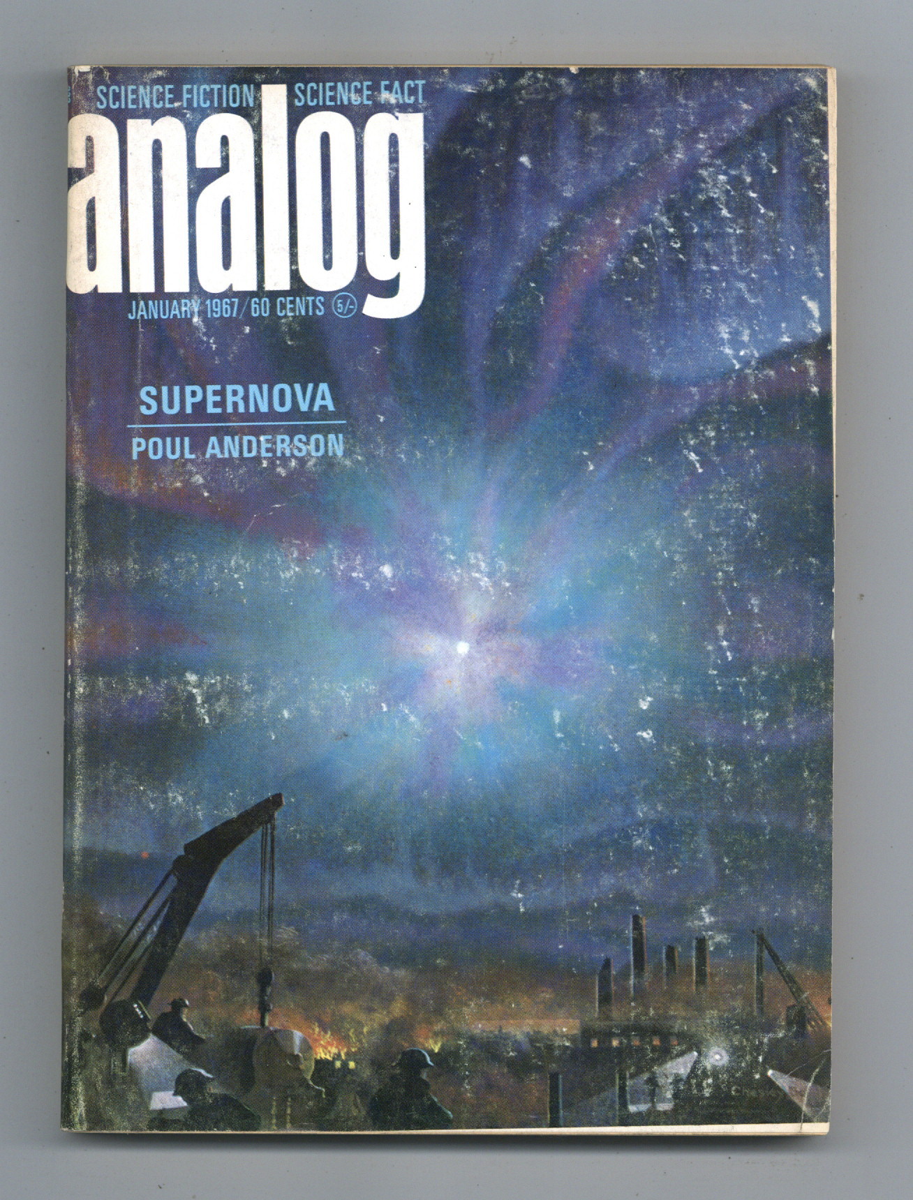 January 1967. Cover by Chesley Bonestell. Stories: "Amazon Planet"(Part 2) by Mack Reynolds, "Supernova" by Poul Anderson, "A Criminal Act" by Harry Harrison, "The Old Shill Game" by H. B. Fyfe, and "The Last Command" by Keith Laumer. Science Fact article: "Bring'em Back Alive!" by Lyle R. Hamilton. Softcover, 5.5-in. x 7.5-in.; 178 newsprint pages, B&W. Cover price $0.60.