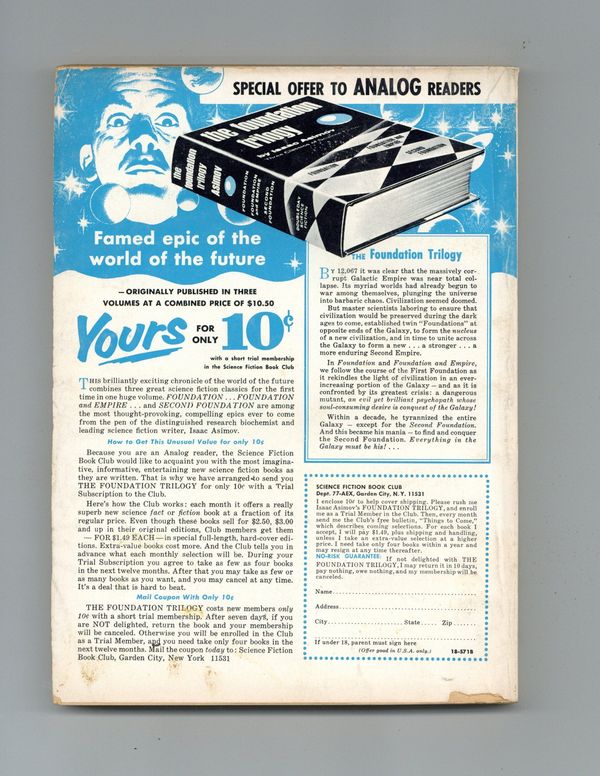 July 1967. Cover by John Schoenherr. Stories: "Computer War"(Conclusion) by Mack Reynolds, "The Man From P.I.G." by Harry Harrison, "Aim for the Heel" by John T. Phillifent, "Compound Interest" by Christopher Anvil, and "Something Important" by E. G. Von Wald. Science Fact article: "Annual Report". Softcover, 5.5-in. x 7.5-in.; 178 newsprint pages, B&W. Cover price $0.60.