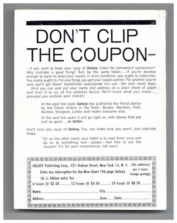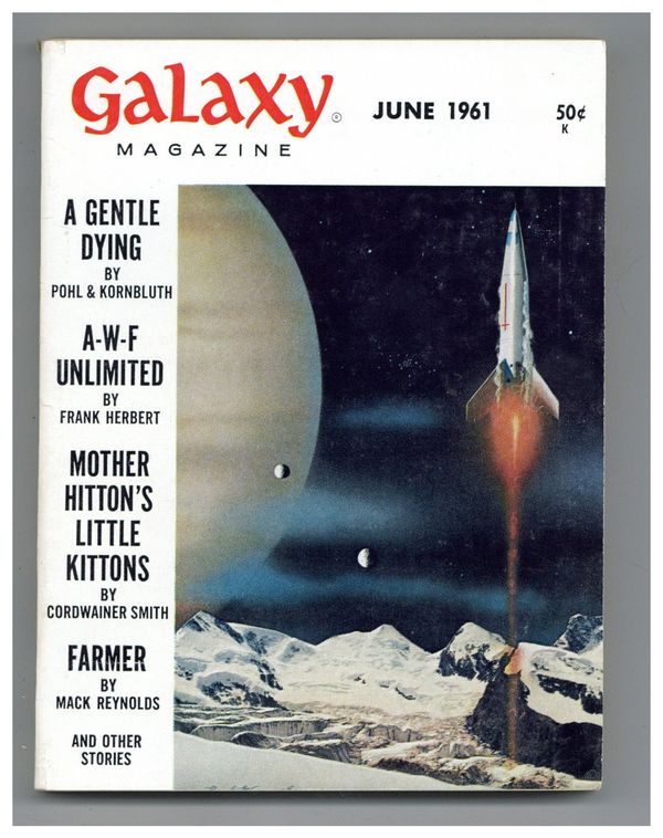 Published Jun 1961 by Galaxy Publications.$8.00June 1961. Cover by Wenzel. Stories: "Farmer" by Mack Reynolds, "The Weirdest World" by R.A. Lafferty, "Mother Hitton's Littul Kittons" by Cordwainer Smith, "A-W-F Unlimited" by Frank Herbert, "The Graybes of Raath" by Neal Barrett, Jr., "A Gentle Dying" by Frederik Pohl and C.M. Kornbluth, "Breakdown" by Herbert D. Kastle, "My Object All Sublime" by Poul Anderson, and "The Long Way Home" by Fred Saberhagen. Softcover Pulp Digest, 5-in. x 7-in.; 194 Pages, B&W. Cover price $0.50.