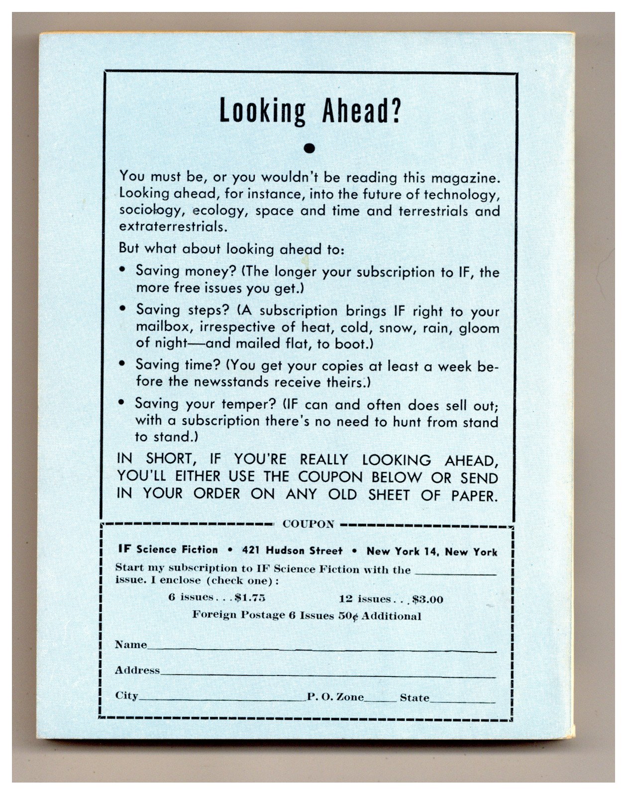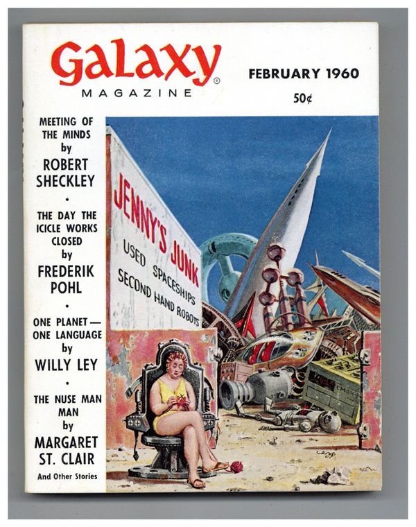 Published Feb 1960 by Galaxy Publications.$3.20February 1960. Cover by Ed Emshwiller (Emsh). Stories: "Meeting of the Minds" by Robert Sheckley, "The Day The Icicle Works Closed" by Frederik Pohl, "Crying Jag" by Clifford D. Simak, "Death's Wisher" by Jim Wannamaker, "The Nuse Man" by Margaret St. Clair, "Dumbwaiter" by James Stamers, "Something Bright" by Zenna Henderson, "East in the Morning" by David E. Fisher. Illustrations by Dick Francis, Wallace Wood, and Dillon. Softcover Pulp Digest, 5-in. x 7-in.; 194 Pages, B&W. Cover price $0.50.