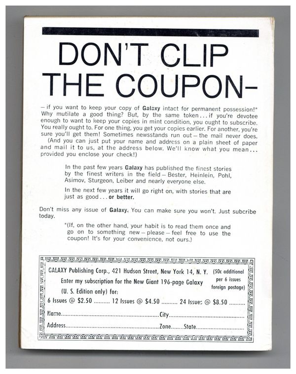 Published Feb 1961 by Galaxy Publications.$10.00- Back cover detached 5%.