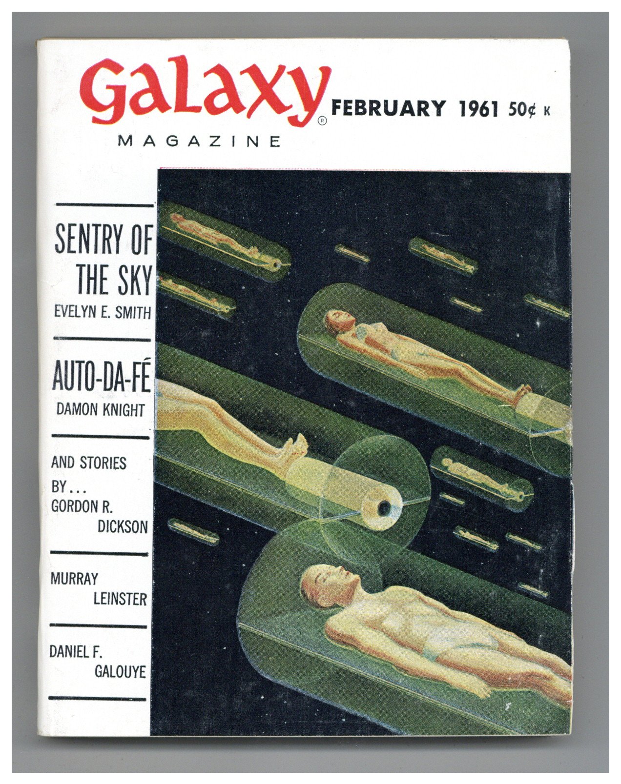 February 1961. Cover by Bob Ritter. Stories: "Sentry of the Sky" by Evelyn E. Smith, "An Honorable Death" by Gordon R. Dickson, "Doctor" by Murray Leinster, "Volume PAA-PYX" by Fred Saberhagen, "The Drug" by C.C. MacApp, "The Chasers" by Daniel F. Galouye, "Doorstep" by Keith Laumer, and "Auto-Da-Fe" by Damon Knight. Illustrations by Bob Ritter, Trattner, Jack Gaughan, Harrington, and Virgil Finlay. Softcover Pulp Digest, 5-in. x 7-in.; 194 Pages, B&W. Cover price $0.50.