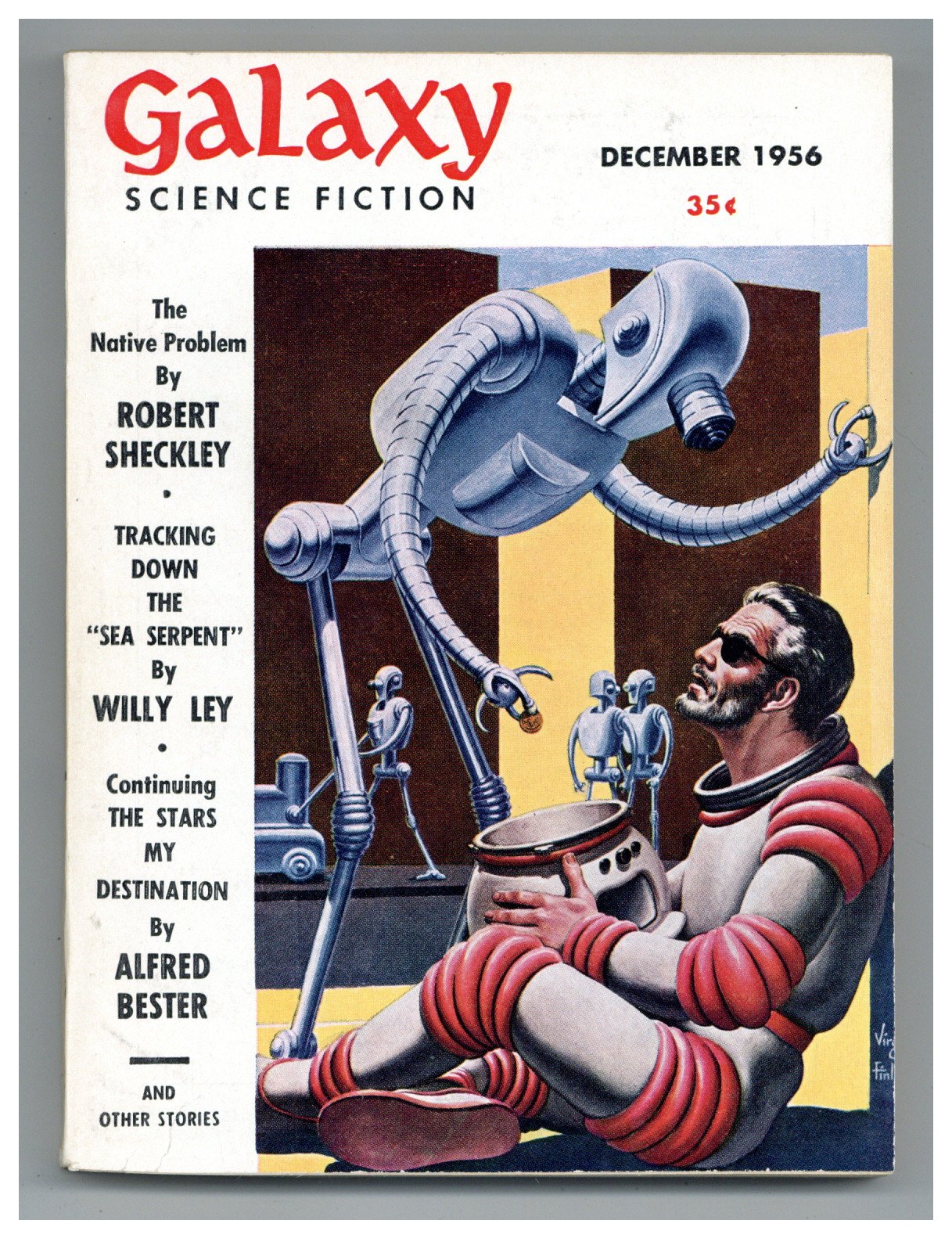 Published Dec 1956 by Galaxy Publications.$5.40December 1956. Cover by Virgil Finlay. Stories: "The Native Problem" by Robert Sheckley, "Rattle Ok" by Harry Warner, Jr., "Of All Possible Worlds" by William Tenn, "You Go" by E.C. Tubb, and "The Stars My Destination" (Part 3 of 4) by Alfred Bester. Illustrations by Virgil Finlay, Jack Gaughan, and Ed Emshwiller (Emsh). Softcover Pulp Digest, 5-in. x 7-in.;144 Pages, B&W. Cover price $0.35.