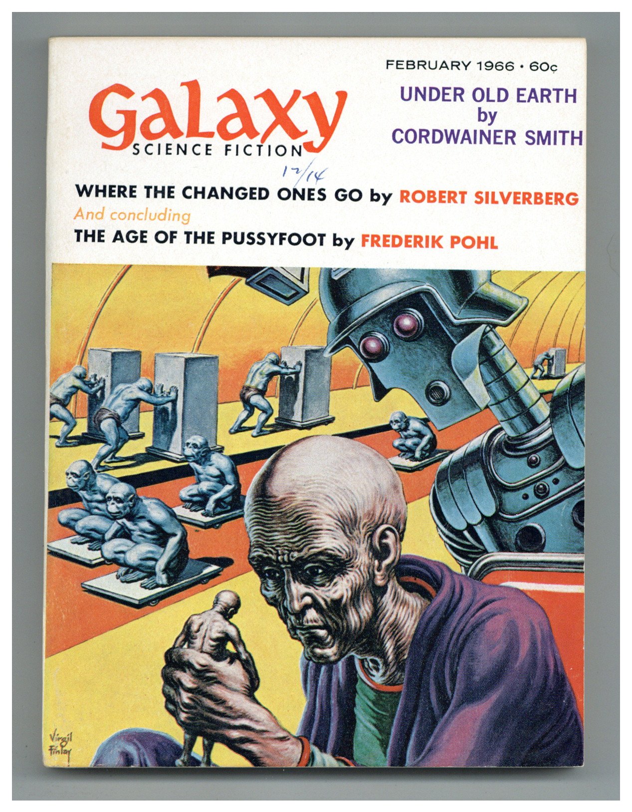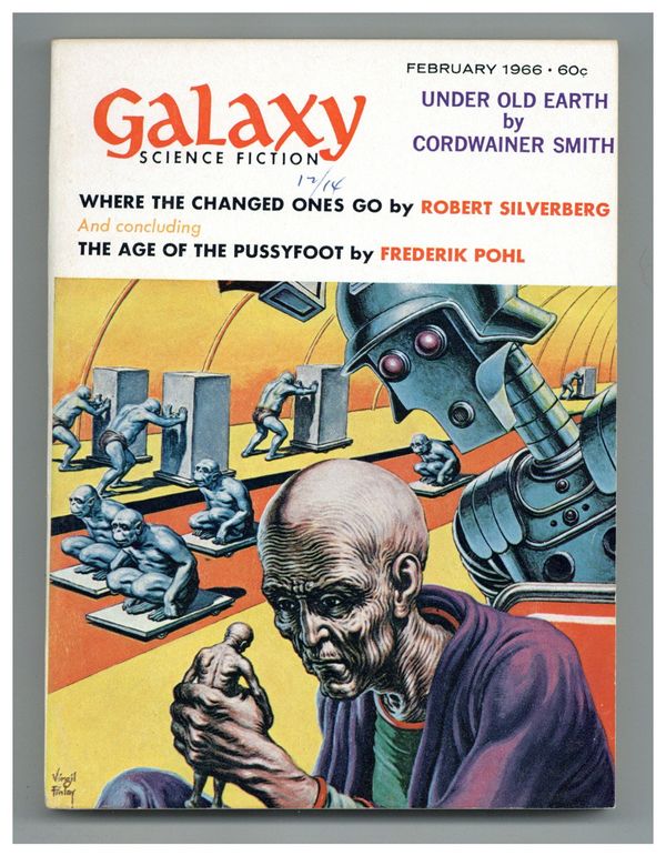 Published Feb 1966 by Galaxy Publications.$18.75February 1966. Cover by Virgil Finlay. Stories: "Under Old Earth" by Cordwainer Smith, "Where The Changed Ones Go" by Robert Silverberg, "Courting Time" by Tom Purdom, "The Echo of Wrath" by Thomas M. Disch, "Eye of an Octopus" by Larry Niven, "In The Imagicon" by George Henry Smith, "Mulligan, Come Home!" by Kim Lang, and "The Age of the Pussyfoot" (Part 3 of 3) by Frederik Pohl. Illustrations by Virgil Finlay, Jack Gaughan, and Wallace Wood. Softcover Pulp Digest, 5-in. x 7-in.;194 Pages, B&W. Cover price $0.50.
