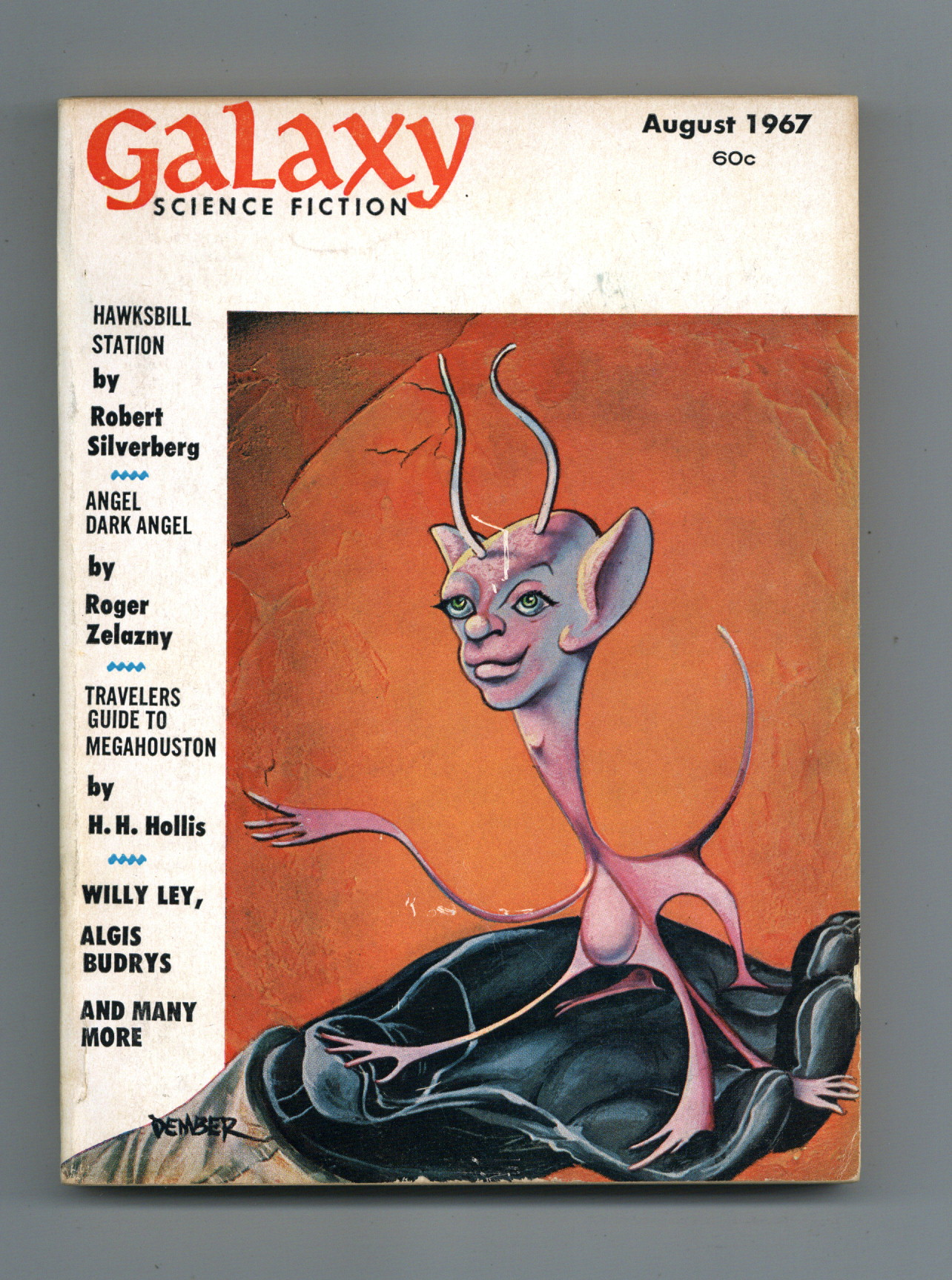 Published Aug 1967 by Galaxy Publications.$8.49August 1967. Cover by Sol Dember. Stories: "Hawksbill Station" by Robert Silverberg, "To Outlive Eternity" (Part 2 of 2) by Poul Anderson, "Angel, Dark Angel" by Roger Zelazny, "We're Coming Through The Window" by K.M. O'Donnell, "Ginny Wrapped In The Sun" by R.A. Lafferty, "9-9-99" by Richard Wilson, "The Being in the Tank" by Ted Thomas, "Hide and Seek" by Linda Marlowe, "The Great Stupids' by Miriam Allen deFord, and "Matrix Goose" by Jack Sharkey. Non-Fact Article: "Travelers Guide To magahouston" by H.H. Hollis. Illustrations by Virgil Finlay, Wallace Wood, Jack Gaughan, and Gray Morrow. Softcover Pulp Digest, 5-in. x 7-in.;194 Pages, B&W. Cover price $0.50.