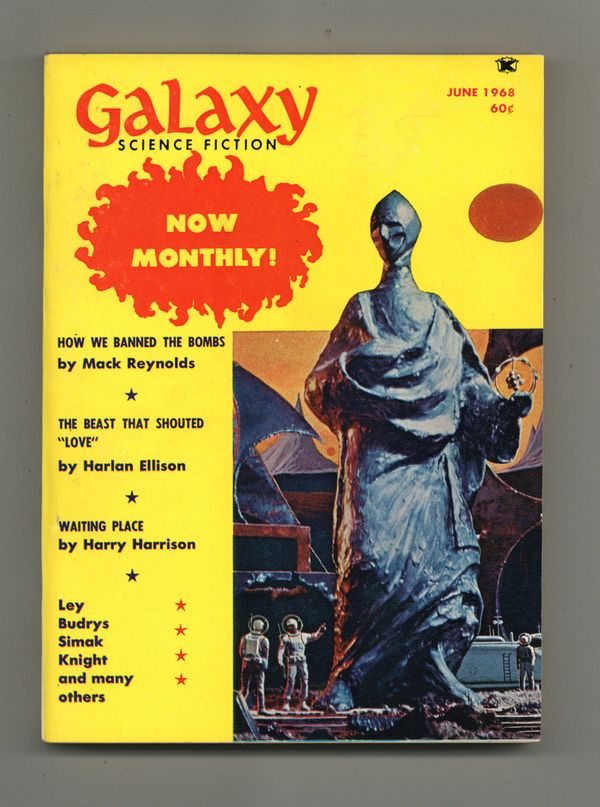 Published Jun 1968 by Galaxy Publications.$15.00June 1968. Cover by Paul Wenzel. Stories: "The Beast That Should Love" by Harlan Ellison, "How We Banned The Bombs" by Mack Reynolds, "Daisies Yet Ungrown" by Ross Rocklynne, "The Garden of Ease" by Damon Knight, "Goblin Reservation" (Part 2 of 2) by Clifford D. Simak, "Detour To Space" by Robin Scott, "Waiting Place" by Harry Harrison, "Booth 13" by John Lutz. Illustrations by Jack Gaughan, Vaughan Bode, Joe Wehrle Jr., and Gray Morrow. Softcover Pulp Digest, 5-in. x 7-in.; 194 Pages, B&W. Cover price $0.60.