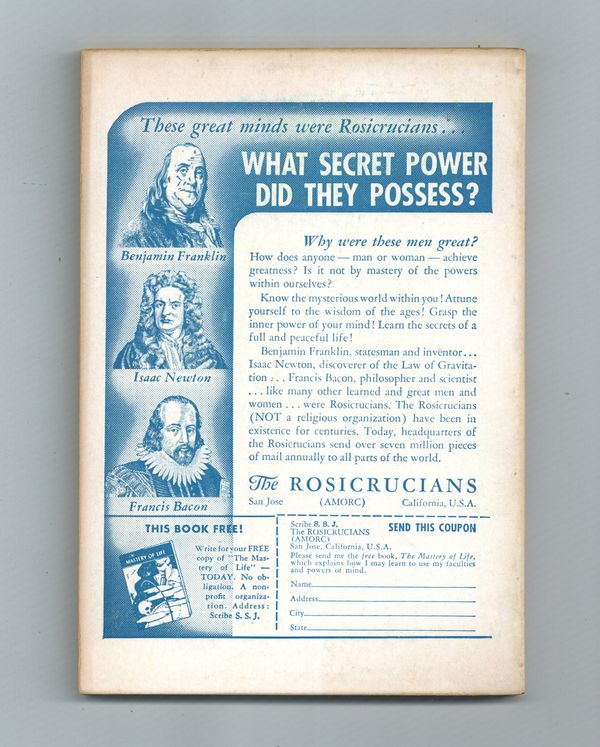 Volume 9 - Number 6, June 1956. Pulp magazine devoted to exploring the paranormal. This issue features The Man Who Was Lost in Time, Magic in Bali, and the Ghost that Hanged a Murderer? Softcover, 5 1/2-in. x 7 1/2-in., 130 page, Text (with B&W Illustrations and Photos). Cover price $0.35.